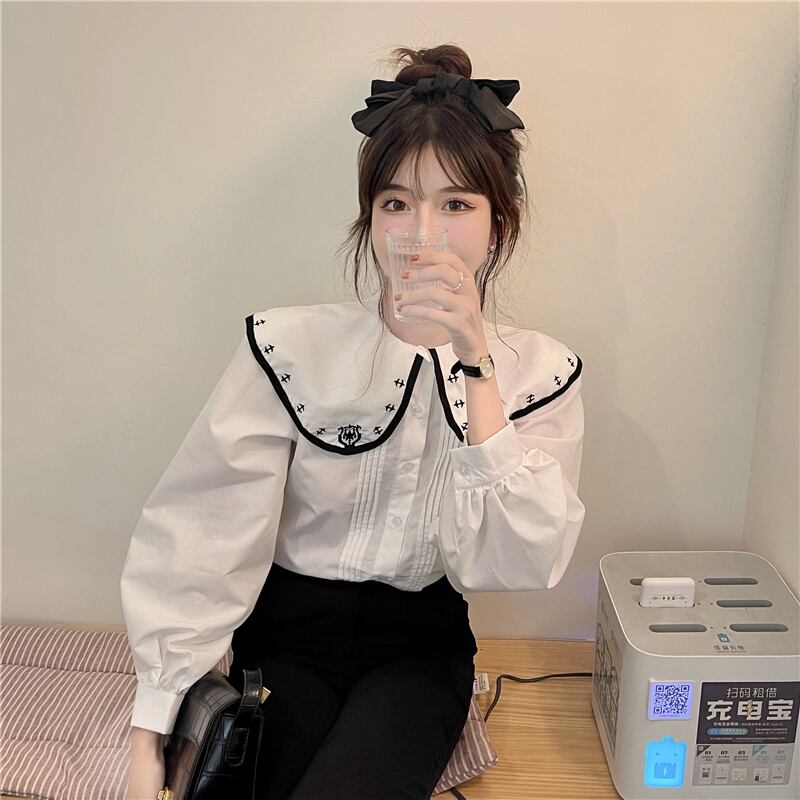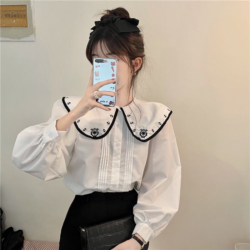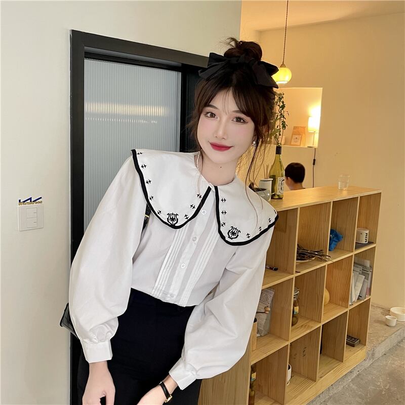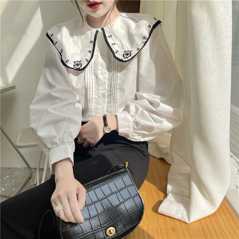 レトロな雰囲気の刺繍襟が目を引く長袖シャツ