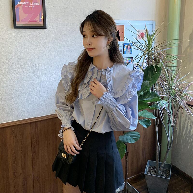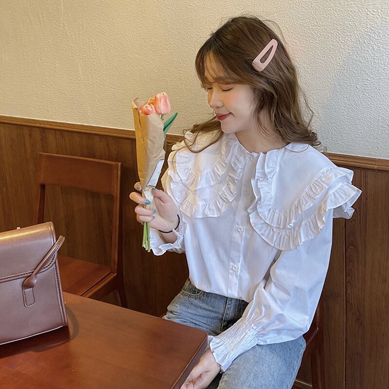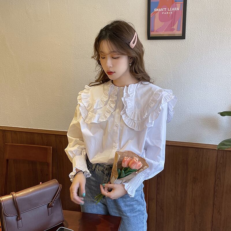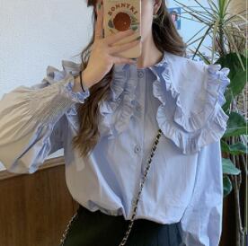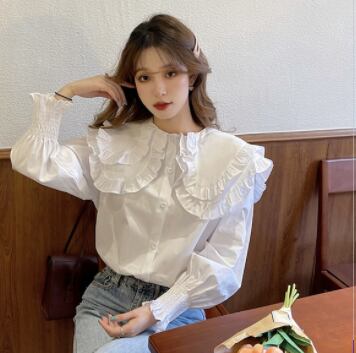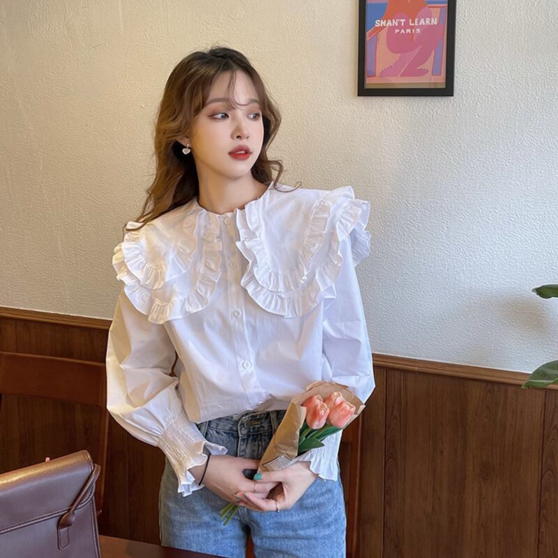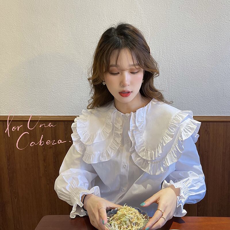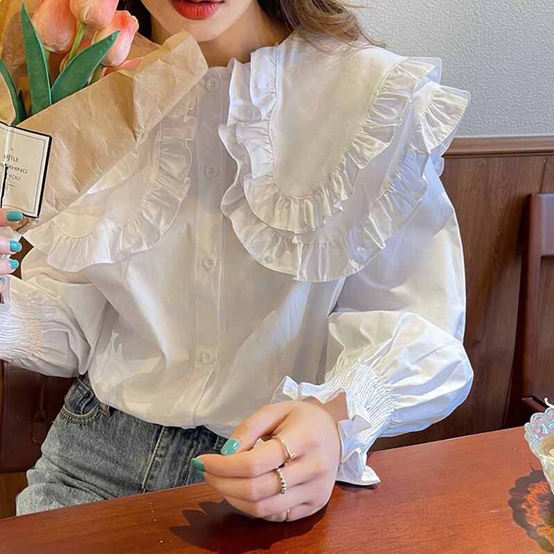 ビッグカラーシャツ トップス シャツ ブラウス スイート ガーリー ホワイト 白 ブルー 青 レギュラー丈 袖あり 長袖 襟付き シャーリング シングルブレスト ボタン フリル 大人女子 大人 上品 おしゃれ デイリーウェア レトロ レトロ風 こなれ感 キュート かわいい 女子 個性的 デザイン 主役級 存在感 無地 春 スプリング 20代 10代 レディース 女性用 学生 学校 通学 デート お出かけ 女子会 食事会 着回し 普段使い ファッション コーデ ワンサイズ