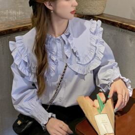ビッグカラーシャツは、ホワイトとブルーの2色展開となっています。トレンドのガーリー&スイートなデザインが際立つ一枚で、シャーリングとフリルがあしらわれた襟元が可愛らしさを演出し、大人女子にも好まれる逸品です。