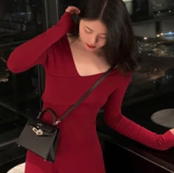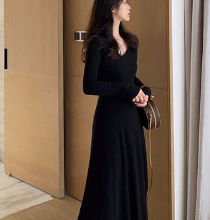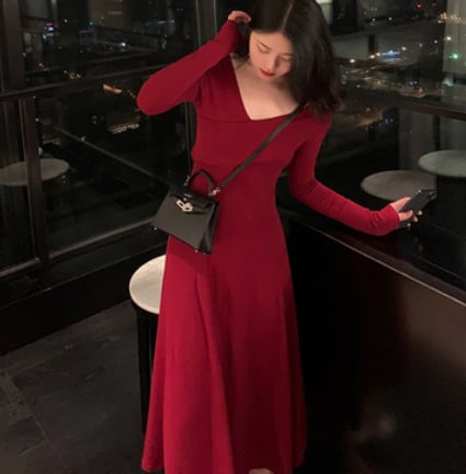 シンプルなVネックAライン長袖ワンピースです。