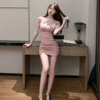 甘いピンクと涼しげなブルーが織り成すチャイナワンピース。シンプルながら細身のシルエットで、女性らしさとスマートな印象を両立させた一枚です。上品で大人可愛いデザインは、様々なシーンに合わせやすく、コーディネートの幅が広がります。
