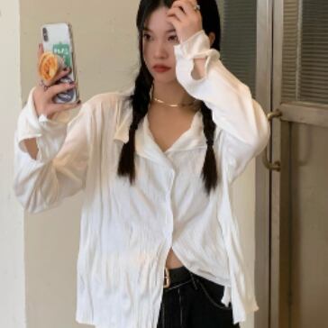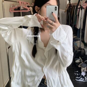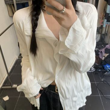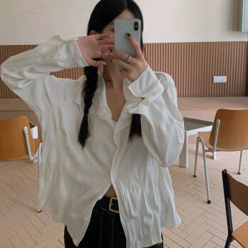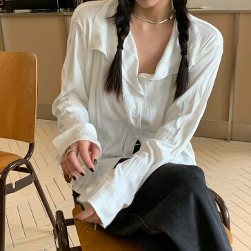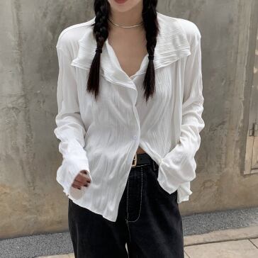 消しプリーツ風の縦縞地模様が入った柔らかな生地のオーバーサイズシャツ。