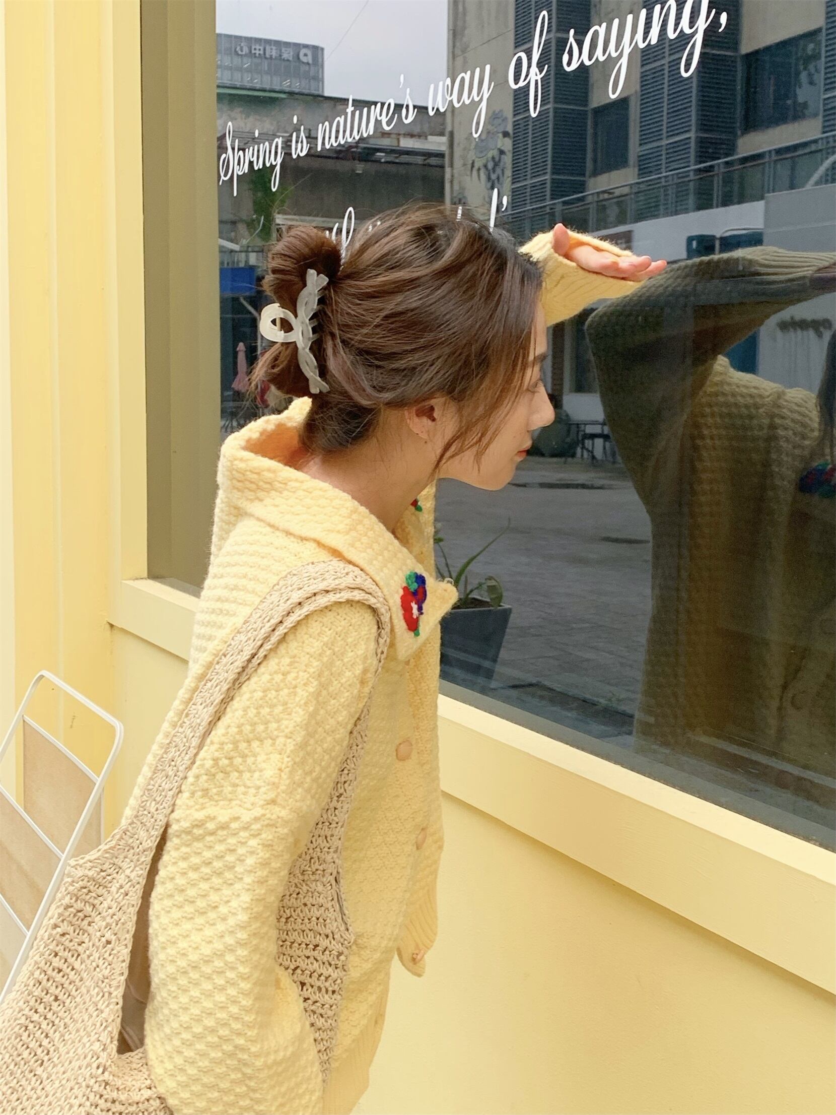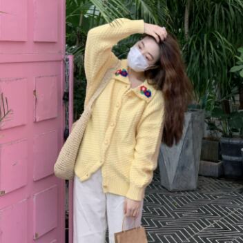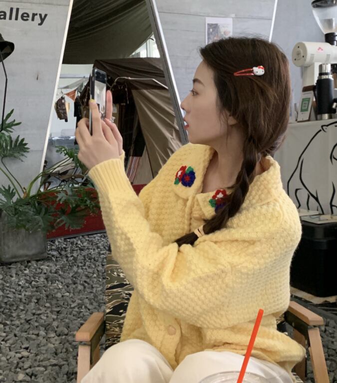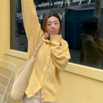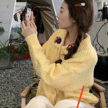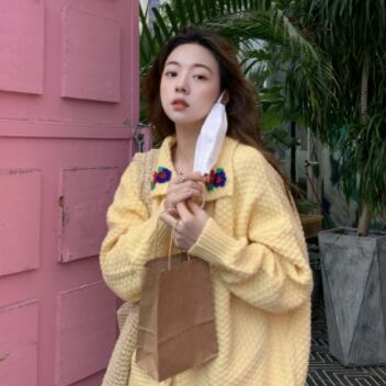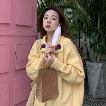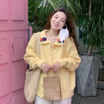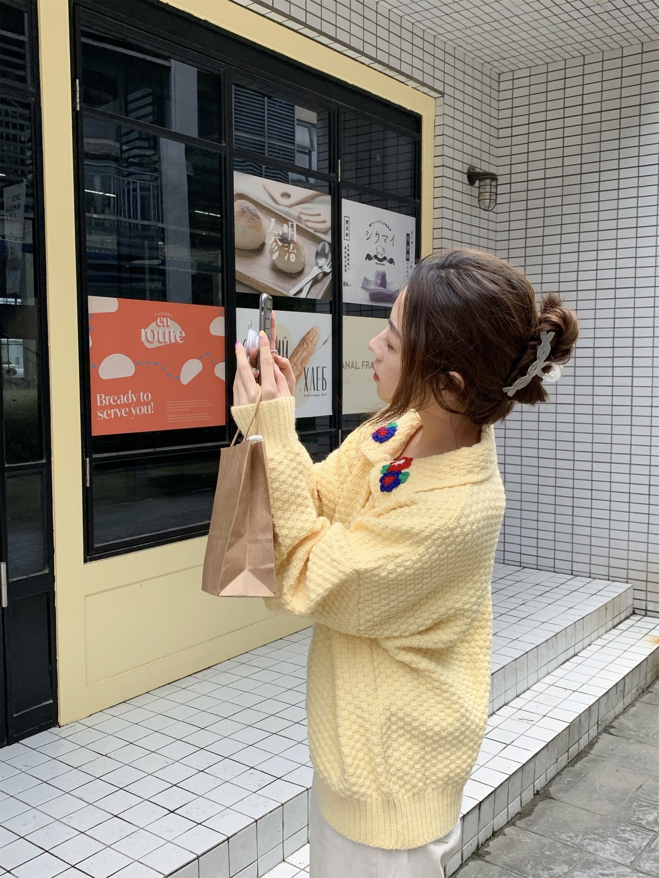 襟フラワー刺繍 配色花模様 オーバーサイズ リラクシー 羽織りもの トップス カーディガン セーター ミディアム丈 袖あり 長袖 ドロップショルダー 襟付き 前開き ニット かわいい 大人可愛い きれいめ シンプル カジュアル 上品 おしゃれ お洒落 レトロ 大人女子 ガーリー キュート 春 秋 冬 レディース 女性用 女の子 学生 通学 デート お出かけ 女子会 休日 着回し 普段使い 重ね着 韓国系 オルチャン ファッション 体系カバー フリーサイズ 大きめ ゆったり ゆる サイズ 黄色 イエロー
