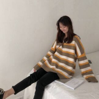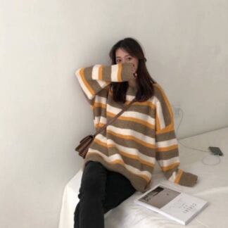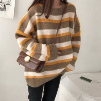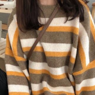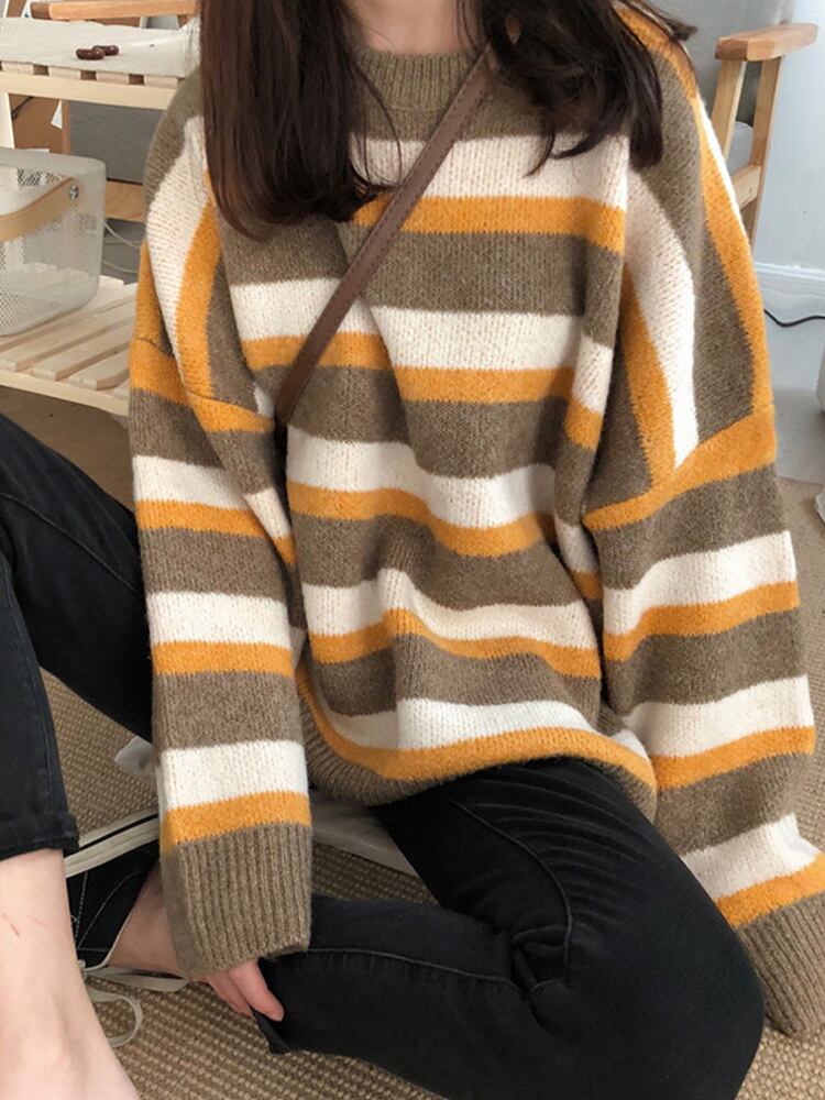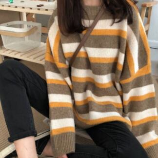ルーズなシルエットが特徴のニットトップスです。ミディアム丈の袖ありデザインで、カジュアルながら上品な印象を与えます。ラウンドネックとストレートワイドなシルエットが、大人女子にぴったりのおしゃれさを演出します。アクリル素材で暖かく、肌触りも良いため、デイリーウェアに最適です。レトロ風のストライプ柄が個性的で、主役級の存在感を放ちます。