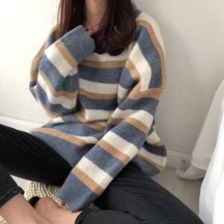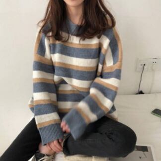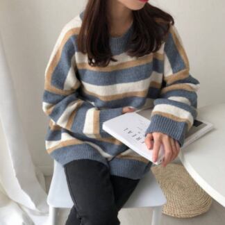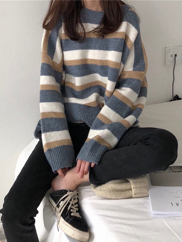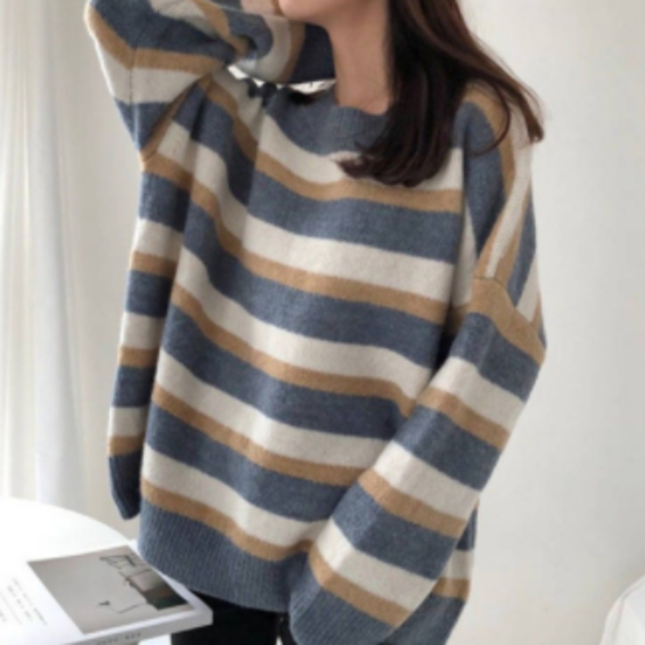 ルーズニット トップス セーター プルオーバー カジュアル ブルー 青 カーキ ミディアム丈 袖あり 長袖 ラウンドネック ストレート ワイド アクリル 大人女子 大人 上品 おしゃれ デイリーウェア レトロ レトロ風 こなれ感 ルーズ シルエット ラフ 個性的 デザイン 主役級 存在感 柄 ストライプ 縞模様 ボーダー 秋 オータム 冬 ウインター 20代 10代 30代 40代 レディース 女性用 学生 学校 通学 休日 おうち らくちん 着回し 普段使い ワンサイズ