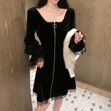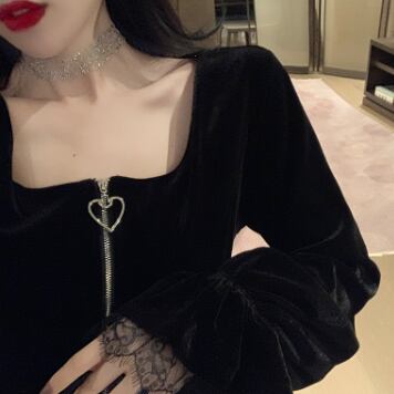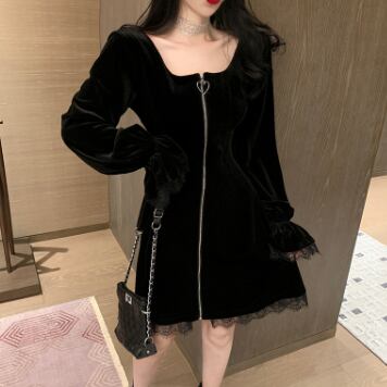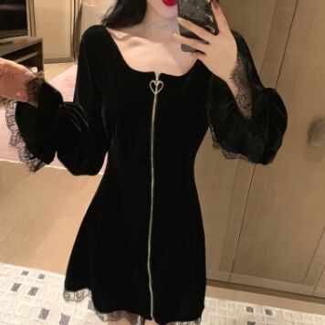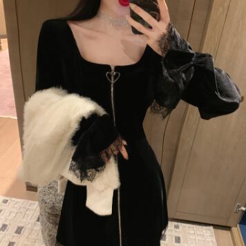 キュートなブラックベルベットのワンピースドレスです。