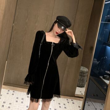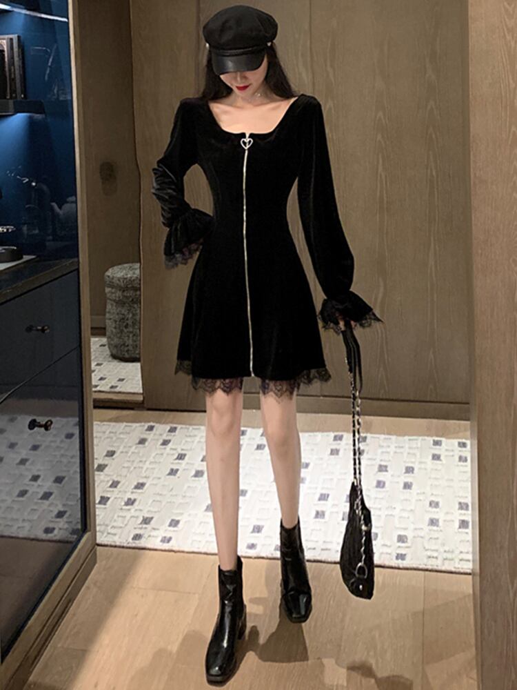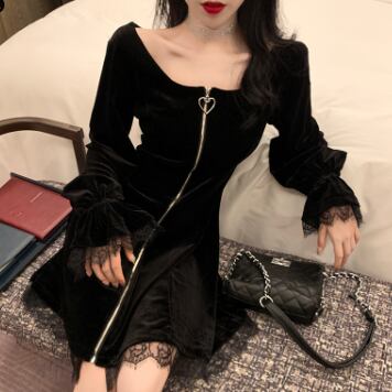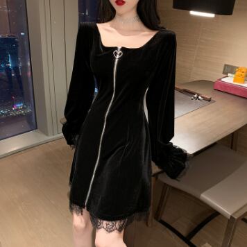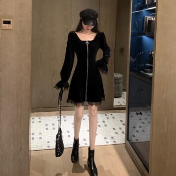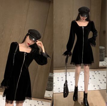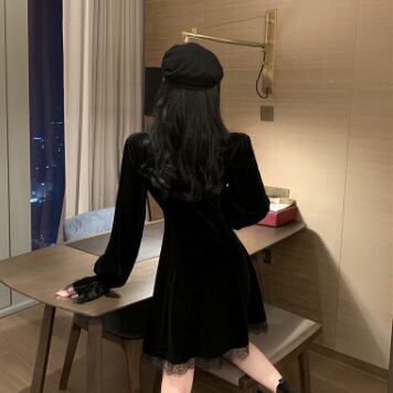 今すぐこのブラックベルベット膝丈ワンピースで、大人可愛い、きれいめ、シンプルな装いを楽しんでください!