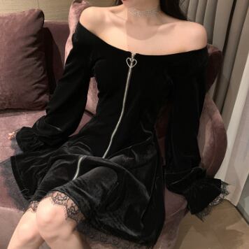 ベルベット素材で高級感が漂う、レースとフリルのかわいいデザイン。オフショルダーで大人可愛く着こなせる。