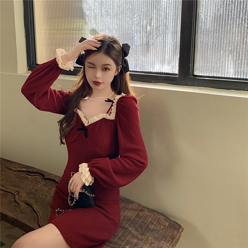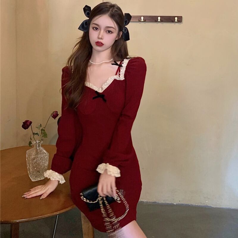 ハートネックデザインでもオフショルダーでも着用可能な、フリルレース&リボン使いが可愛らしいほっそりシルエットのニットワンピース。