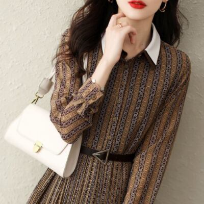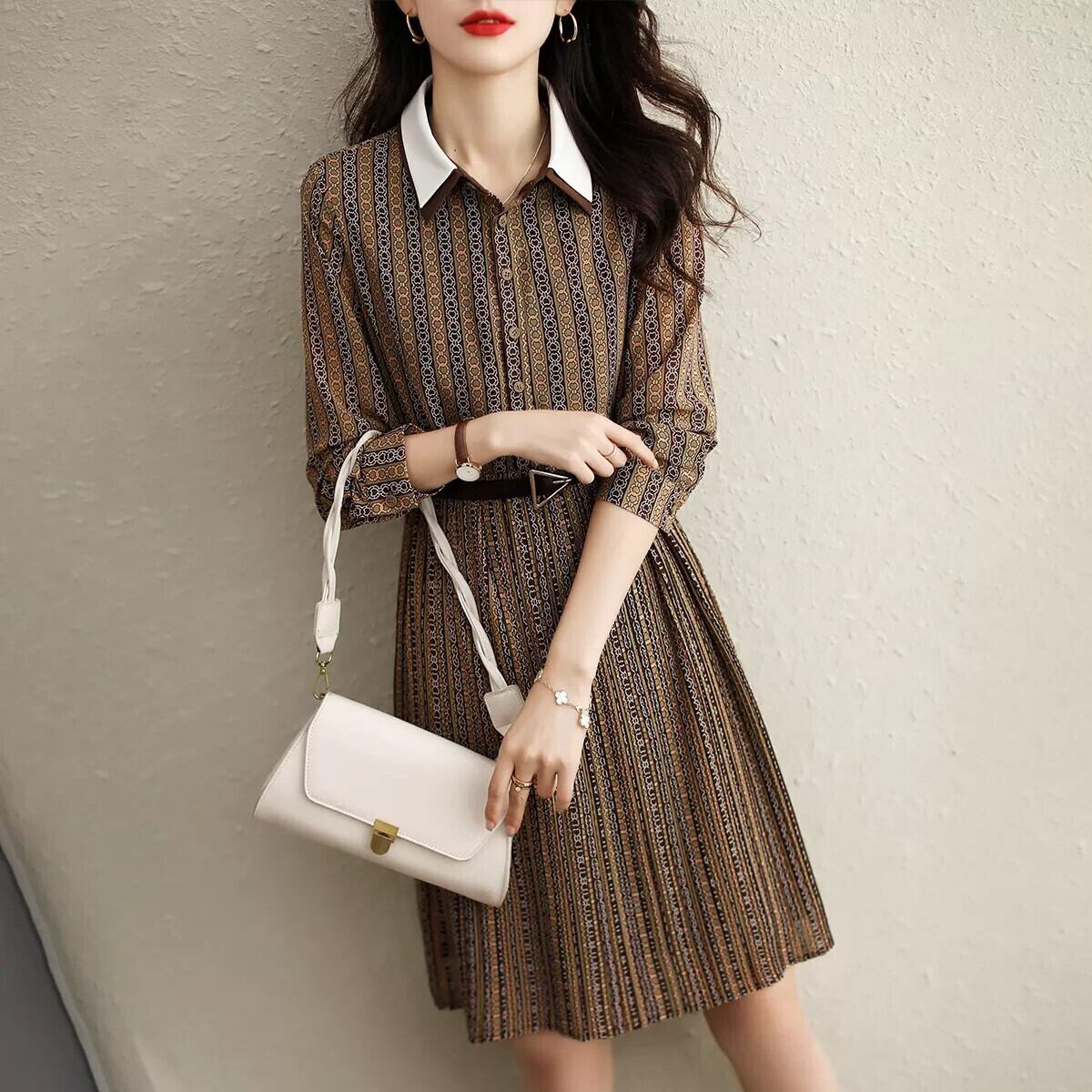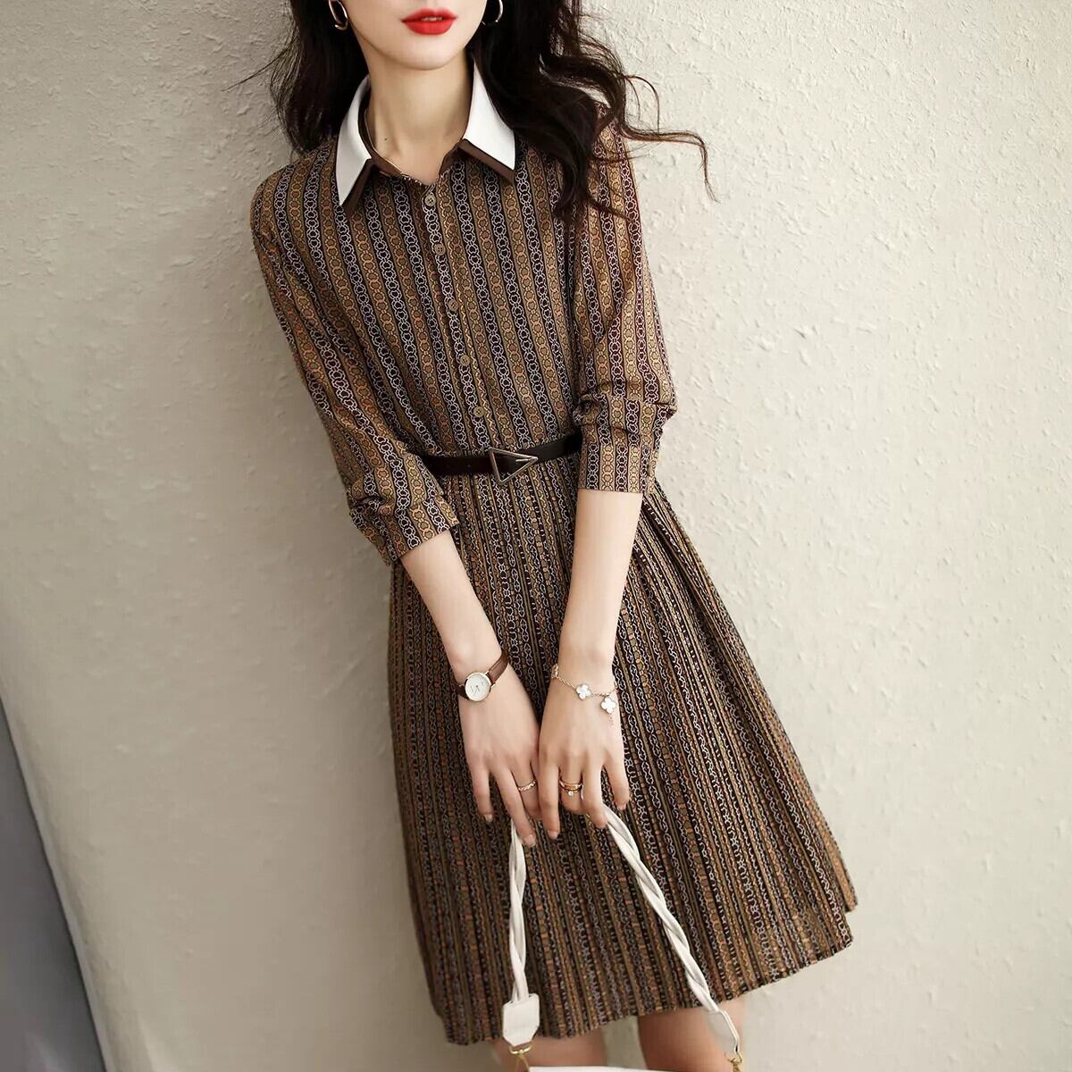 制服のような洗練されたスタイルが魅力のフレアワンピース。秋冬の装いにもぴったりな上品なブラウンカラーで、大人の女性に似合うスマートで上品な着こなしを叶えます。細身のシルエットで、脚長効果も期待できます。