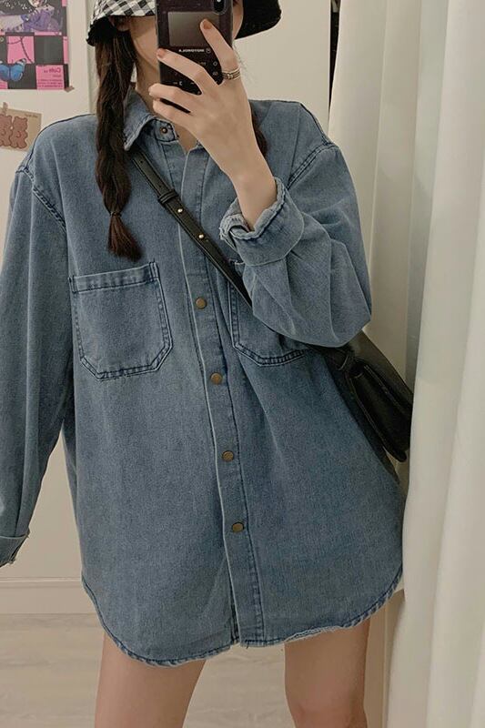 デニムシャツ トップス シャツ ブラウス カジュアル ブルー 青 レギュラー丈 袖あり 長袖 襟付き ストレート シングルブレスト ボタン デニム 大人女子 大人 上品 おしゃれ デイリーウェア レトロ レトロ風 こなれ感 ルーズ シルエット ラフ 個性的 デザイン 主役級 存在感 無地 春 スプリング 秋 オータム 20代 10代 30代 40代 レディース 女性用 デート お出かけ 女子会 食事会 ファッション コーデ S M L XL 2XL 3XL 大きいサイズ