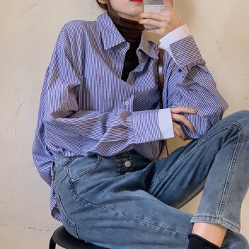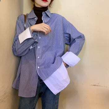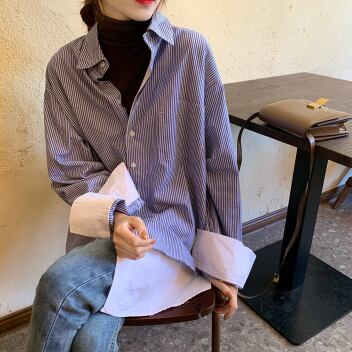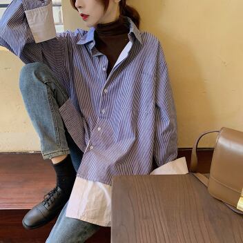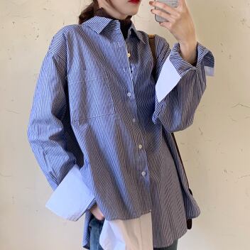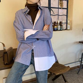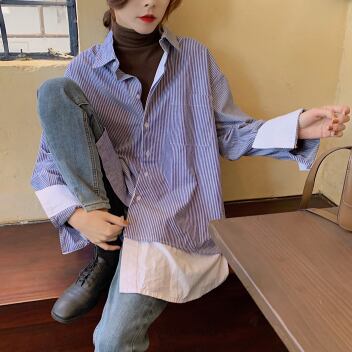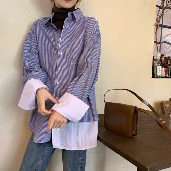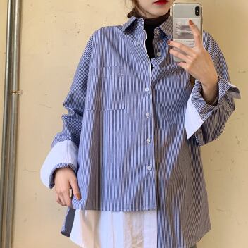 ストライプシャツ フェイクツーピース トップス シャツ ブラウス カジュアル ブルー 青 レギュラー丈 袖あり 長袖 襟付き ストレート シングルブレスト ボタン 大人女子 大人 上品 おしゃれ デイリーウェア レトロ レトロ風 こなれ感 個性的 デザイン 主役級 存在感 柄 ストライプ 縞模様 ボーダー 春 スプリング 20代 30代 レディース 女性用 オフィス ビジネス OL 通勤 学生 学校 通学 着回し 普段使い S M L XL 2XL 3XL 大きいサイズ