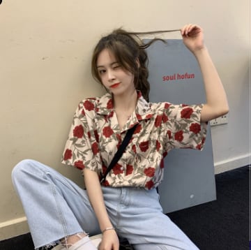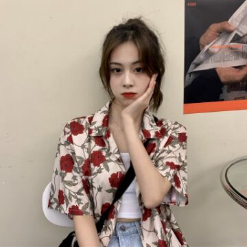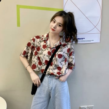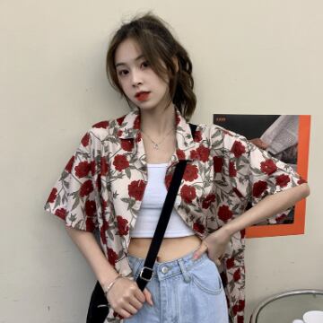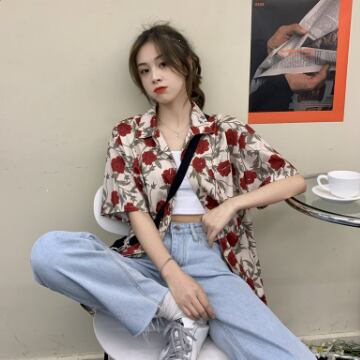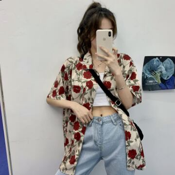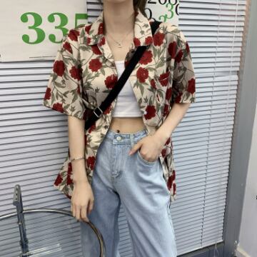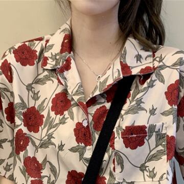 鮮やかなローズ柄が目を引くシフォンシャツ