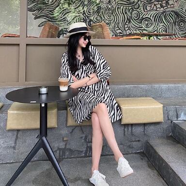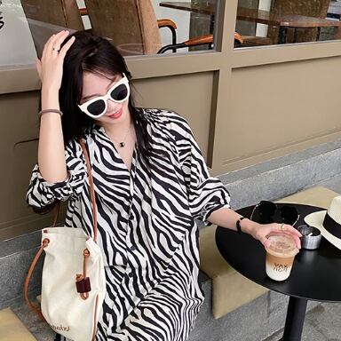 個性的なゼブラ柄のワンピースが登場!Vネックで女性らしさもアピールでき、袖付きの長袖タイプなので、程よいフェミニンさと上品さが漂います。トップス風のショート丈で、ボタンを留めてシングルブレストに着用することもでき、気分に合わせて着こなせる嬉しいアイテムです。