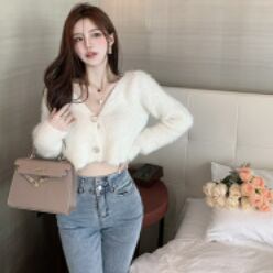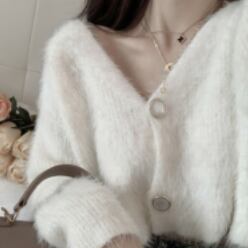 大きめボタンがレトロで可愛いシャギーニットカーディガンです。