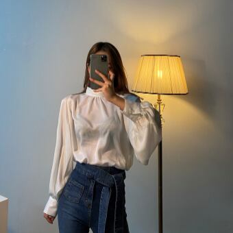 素材は、光沢感のあるサテン生地を使用。そのため、清潔感あふれる上品な雰囲気に仕上がっています。また、スタンドカラーの首元は小顔効果も期待できます。レギュラー丈の長袖は、秋のファッションにぴったり。