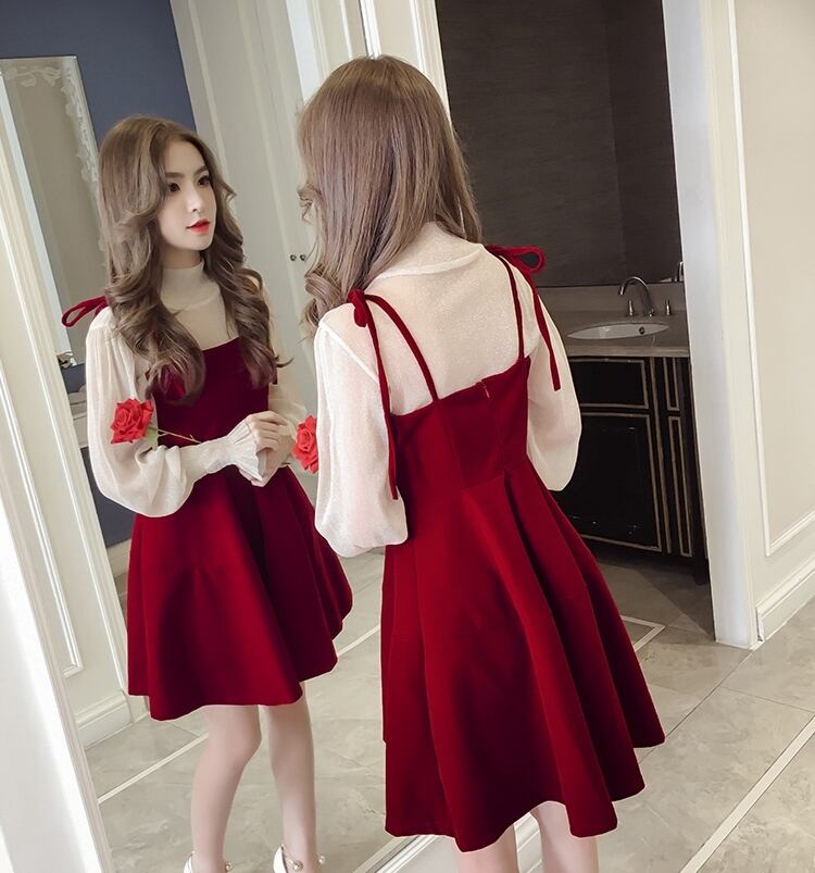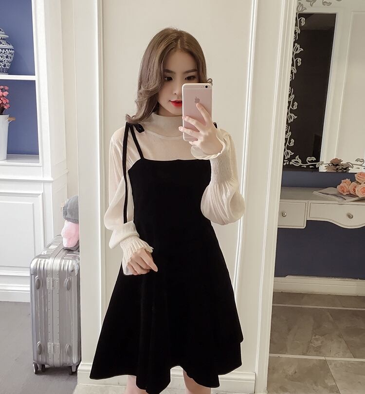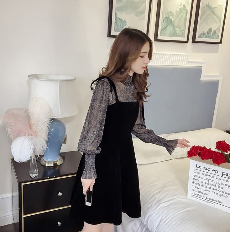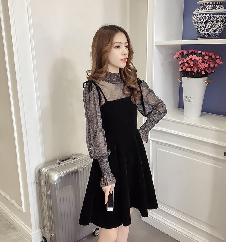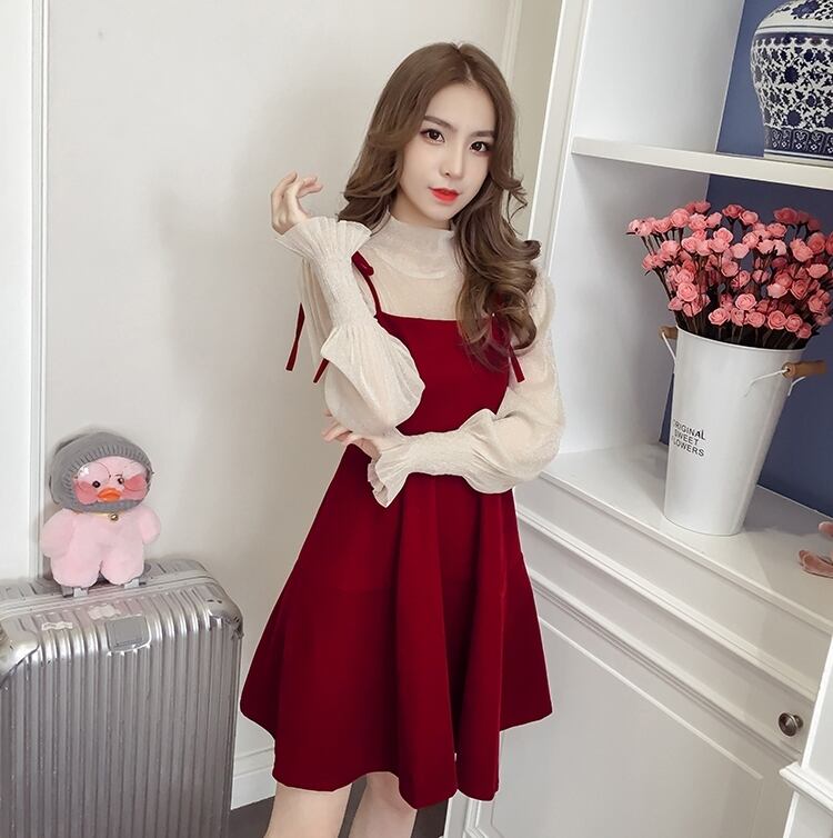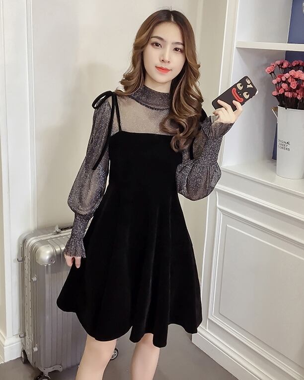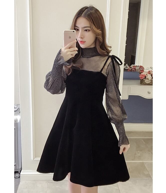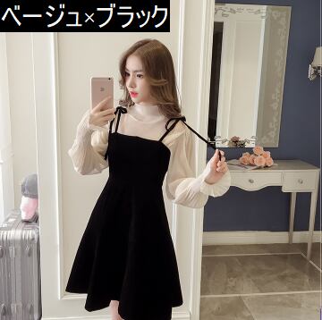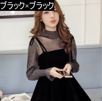ぽわん袖 ラメ入り キャンディスリーブ シアートップス×キャミワンピ リボンストラップ セットアップ ブラウス キャミソールワンピース ミディアム丈 膝上 ひざ丈 袖なし 長袖 パフスリーブ ボリューム袖 Aライン セミフレア ハイネック 透け感 ベルベット 異素材MIX 上下セット 2点セット かわいい 大人可愛い きれいめ シンプル 上品 おしゃれ ガーリー 無地 秋 冬 レディース 女の子 イベント パーティー 韓国系 オルチャン S M L XL 2XL 3XL ブラック ベージュ レッド
