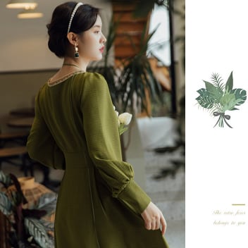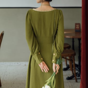 長袖のスクエアネックがエレガントな、クラシックロングワンピースです。フレアのAラインが女性らしいシルエットを作り出し、ウエストマークでスタイルアップも叶います。淡い緑色の無地デザインは、大人っぽく上品な雰囲気を演出してくれます。