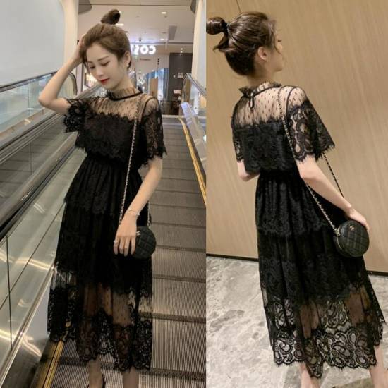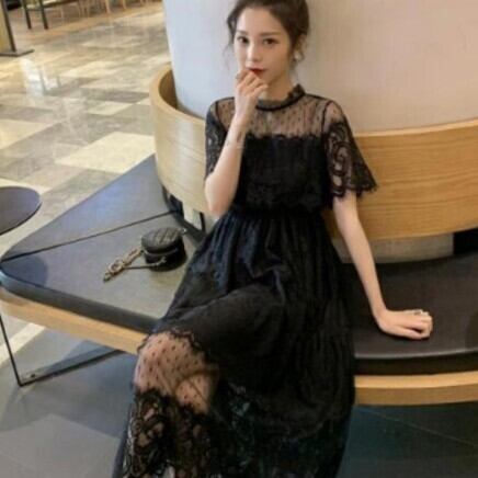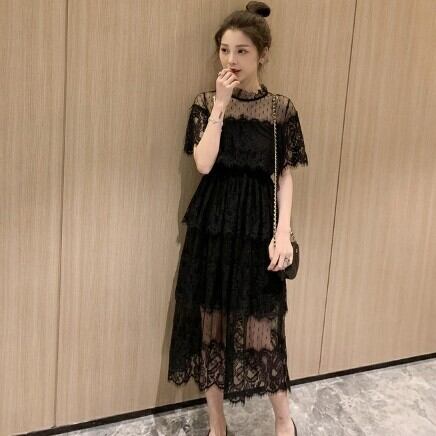 ワンピース 女子会 食事会 レース ブラックドレス 半袖 セミフレア ミモレ丈 透け感 10代 20代 30代 夏 大きいサイズ 新作 韓国オルチャン ドレス 韓国 パーティードレス プチプラ 激安 安い ワンピース 結婚式 お呼ばれ 二次会 演奏会 即納 レディース 同窓会 忘年会 食事会 通勤 OL デート モテ 合コン スーツスリーピース 上品 ミモレ丈 エレガント シック 華奢見せ スタイルアップ ハイウエスト 丸首 ペンシルパンツ 送料無料