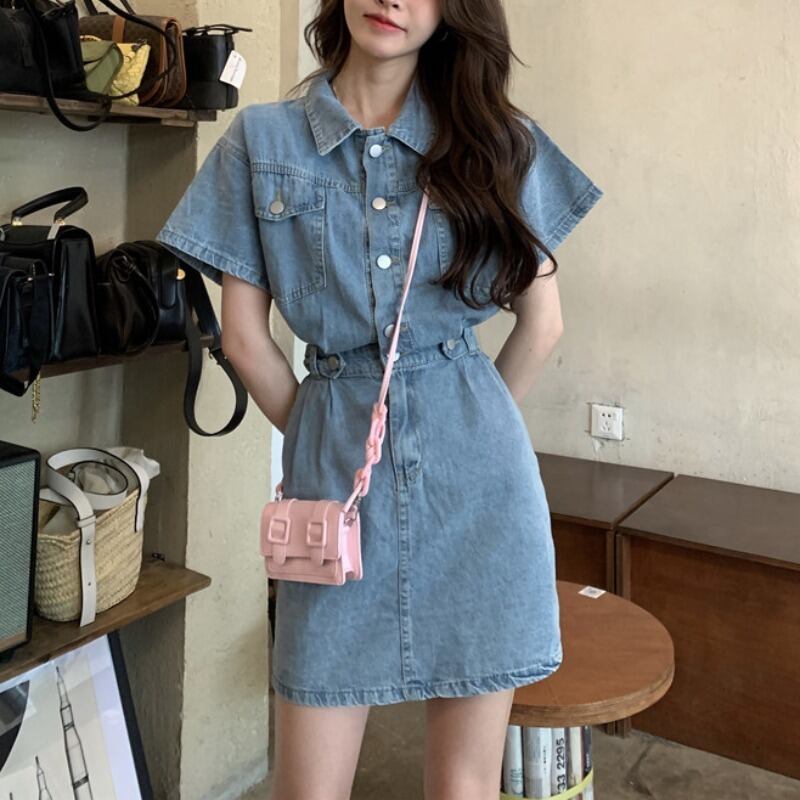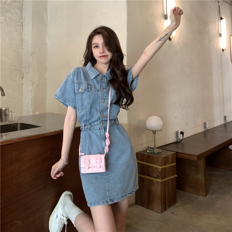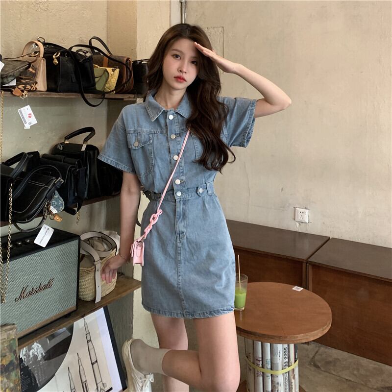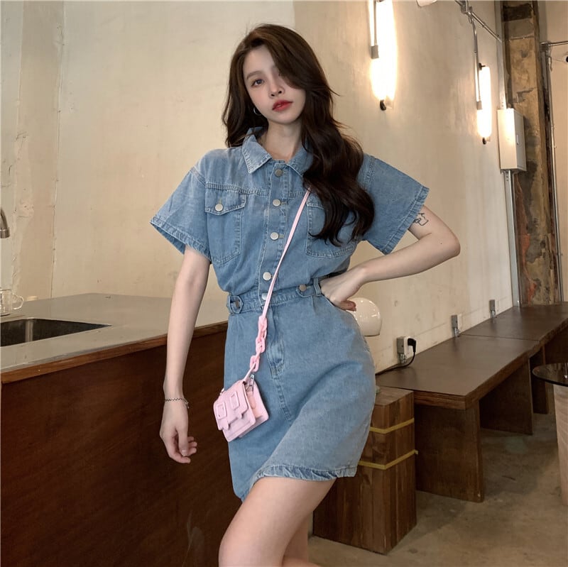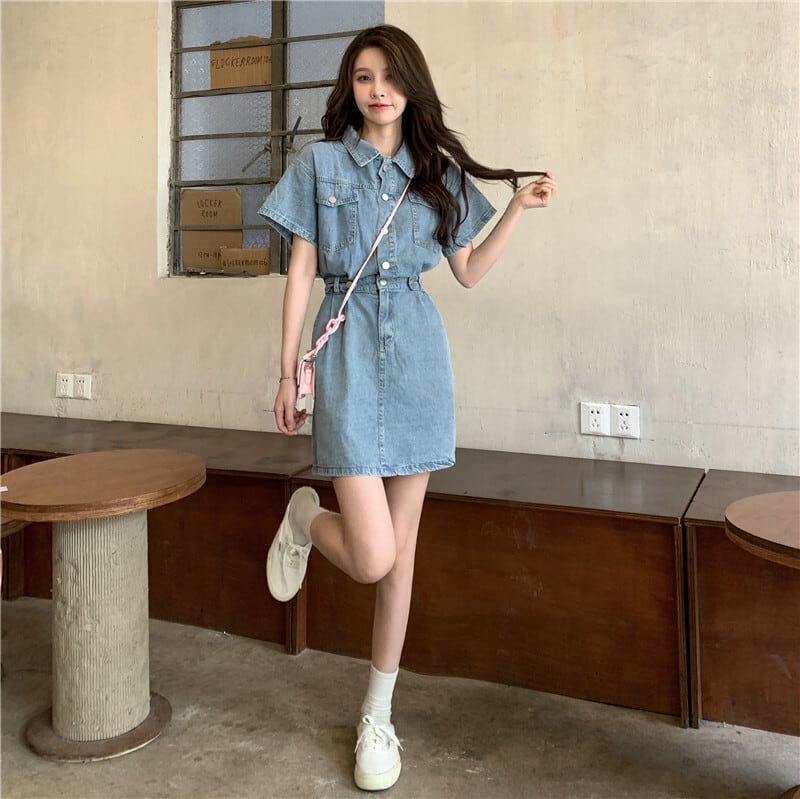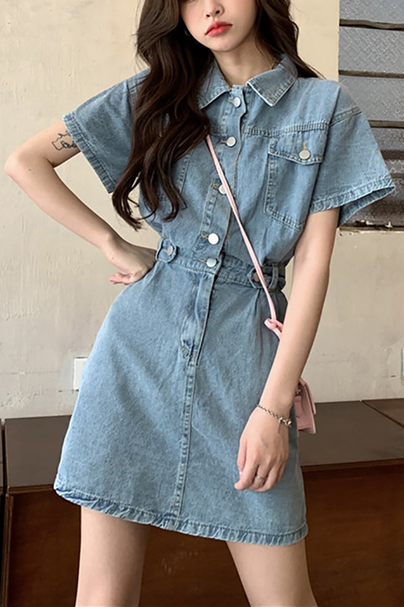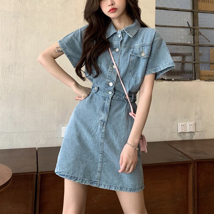 デニムワンピース カジュアル ブルー 青 ミニ丈 ショート丈 袖あり 半袖 襟付き スリム 細身 タイト ボタン ポケット 大人女子 大人 上品 おしゃれ デイリーウェア レトロ レトロ風 こなれ感 個性的 デザイン 主役級 存在感 無地 春 スプリング 夏 サマー 20代 10代 レディース 女性用 学生 学校 通学 デート お出かけ 女子会 食事会 着回し 普段使い トレンド ファッション コーデ 美脚 足長 細見え スタイル S M L