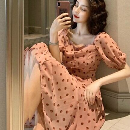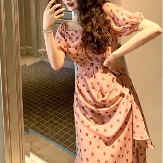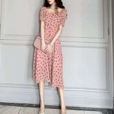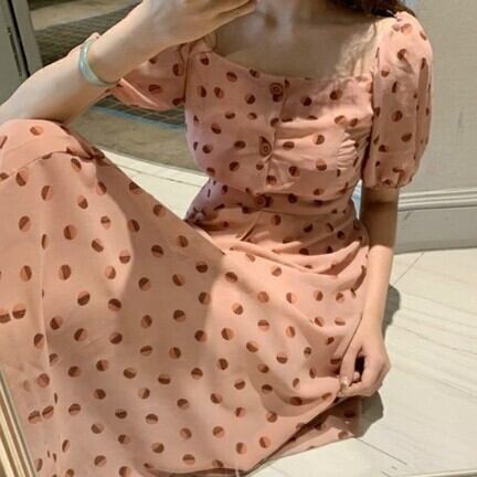 オシャレで可愛らしい、水玉ワンピースのご紹介です。ピンク系のグラデーションカラーが可愛らしい半袖のパフスリーブがポイント。ミモレ丈で上品な印象を与え、さらにカジュアルでこなれた雰囲気も兼ね備えています。