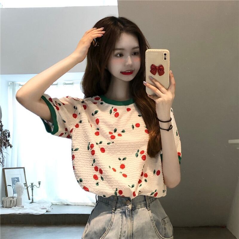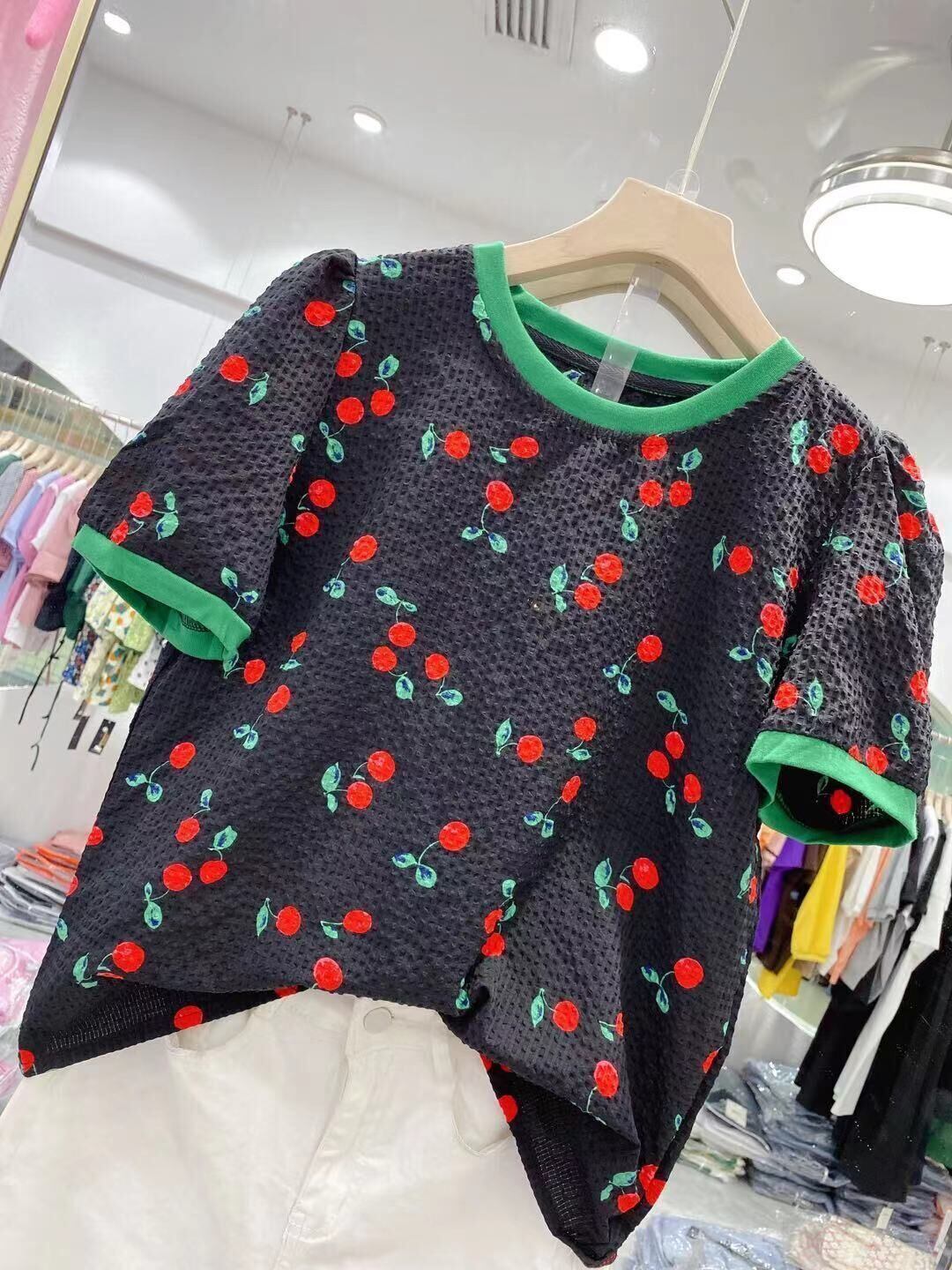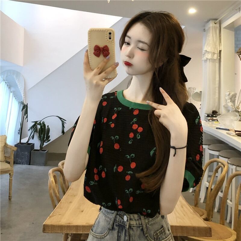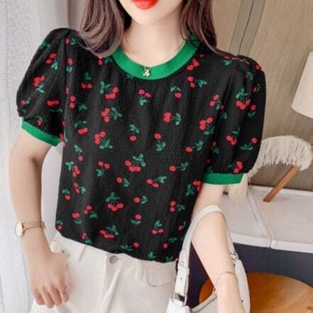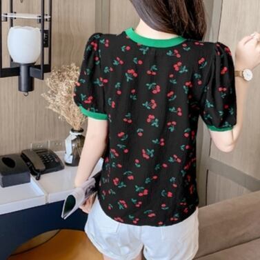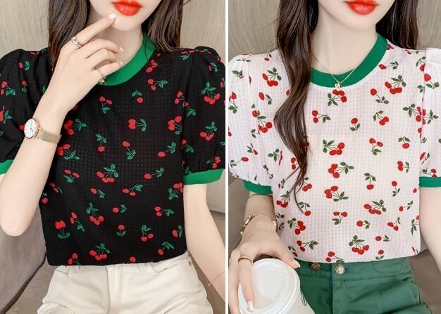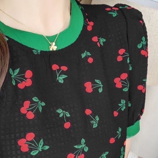 サクランボティーシャツ サクランボ柄 半袖 レトロ風デザイン 今風 パフスリーブ袖ボ リューム袖 可愛いデザイン サマータイム チェリー ブラック ホワイト ラウンドネック サクランボプリント パフスリーブプルオーバーシャツ レディース サマー ニュー ルーズ マッチカジュアル トップス 大人可愛い きれいめ シンプル 大人 アジアン こなれ感 爽やか ナチュラル お出かけ お泊まり 休日 旅行 ガーデン 着回し 普段使い ファッション コーデ スタイル 楽ちん プレゼント ギフト 定番 プチプラ