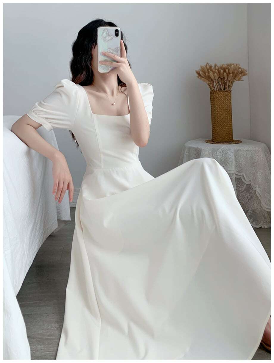 シンプルドレス ワンピース ワンピドレス ロング丈 シンプル 無地 ホワイト ブラック レッド 半袖 パフスリーブ スクエアカラー ロングスカート ウエストスリム 夏ドレス パーティー イベント 冠婚葬祭 結婚式 二次会 飲み会 コンパ お呼ばれ ホームパーティー サマーパーティー シンプルデザイン 外国風インポートファッション モデル風 かわいい 大人可愛い きれいめ シンプル 大人 上品 おしゃれ かっこいい レトロ 大人女子 個性的 クール モード系 エレガント モダン 主役級 抜け感 レディース