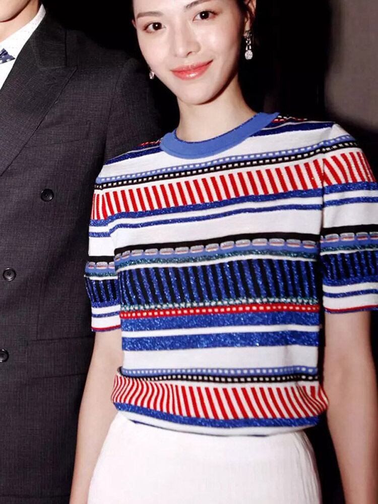 サマーニット 半袖 ニット 夏 ストライプ シマシマ デザイン重視 人気デザイン 新作 ブロッキングストライプ ラウンドネック 半袖Tシャツ レディース スリム 細身 ストレート スマート かわいい きれいめ シンプル 大人 上品 おしゃれ 大人可愛い 大人女子 こなれ感 ラフ クール 謝恩会 二次会 学生 通学 デート お出かけ 女子会 お泊まり 休日 アウトドア パーティー イベント リゾート 旅行 ホテル レストラン 着回し 普段使い 韓国 韓国系 オルチャン ファッション コーデ スタイル ギフト
