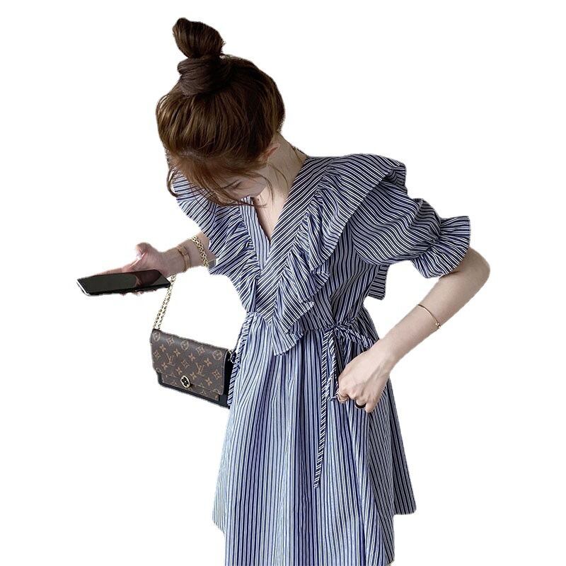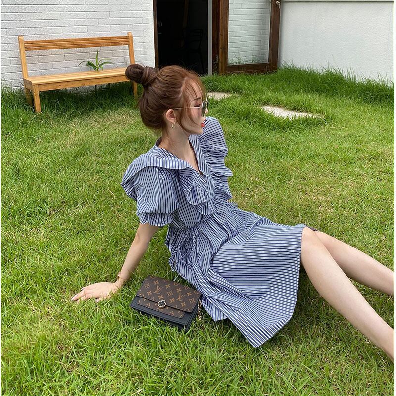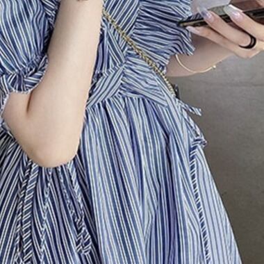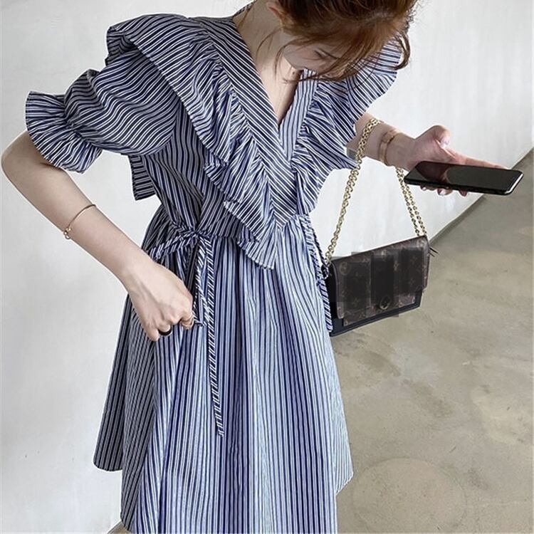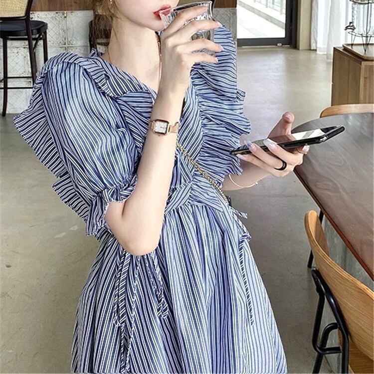 ワンピース レディース シャツワンピ ストライプ ブルー パフスリーブ リボン フリル ボタン ミモレ丈 半袖 ハイウエスト切替 柄物 個性的 存在感 Aライン 裾フレア シンプル 大人可愛い かわいい 大人 おしゃれ かっこいい インパクト エレガント カジュアル ラフ 4サイズ サイズ豊富 ブルー 10代 20代 30代 お出かけ デート オケージョン 食事会 女子会 ショッピング 休日 旅行 イベント パーティー 着回し 普段使い 韓国系 ファッション コーデ おすすめ モテ 体型カバー 脚長