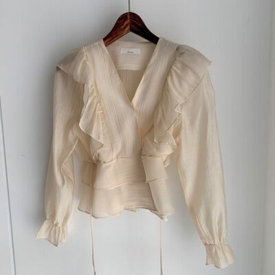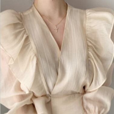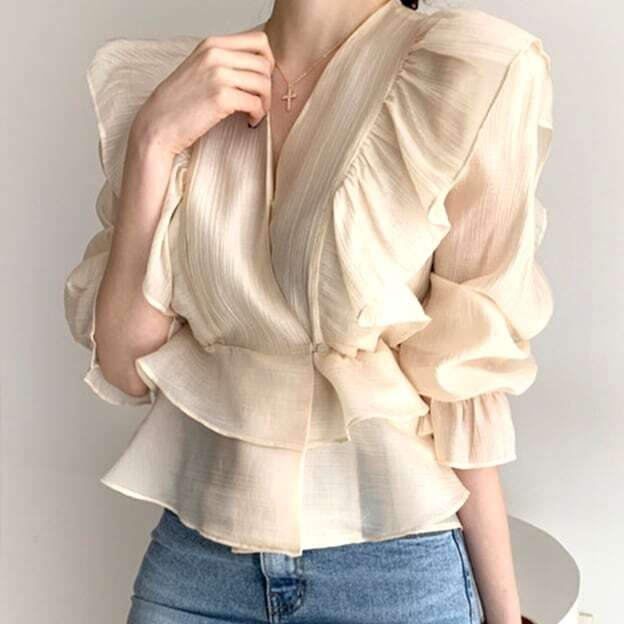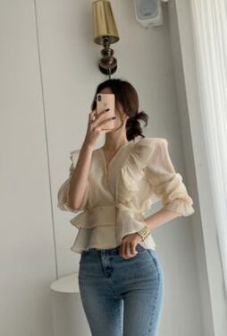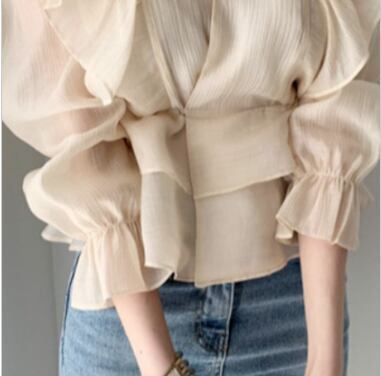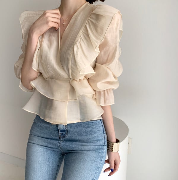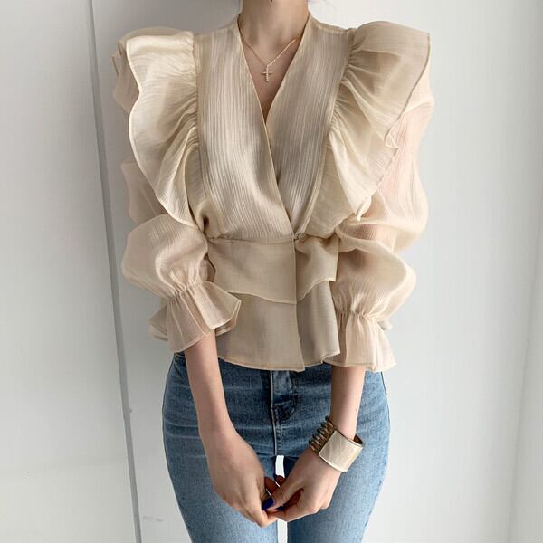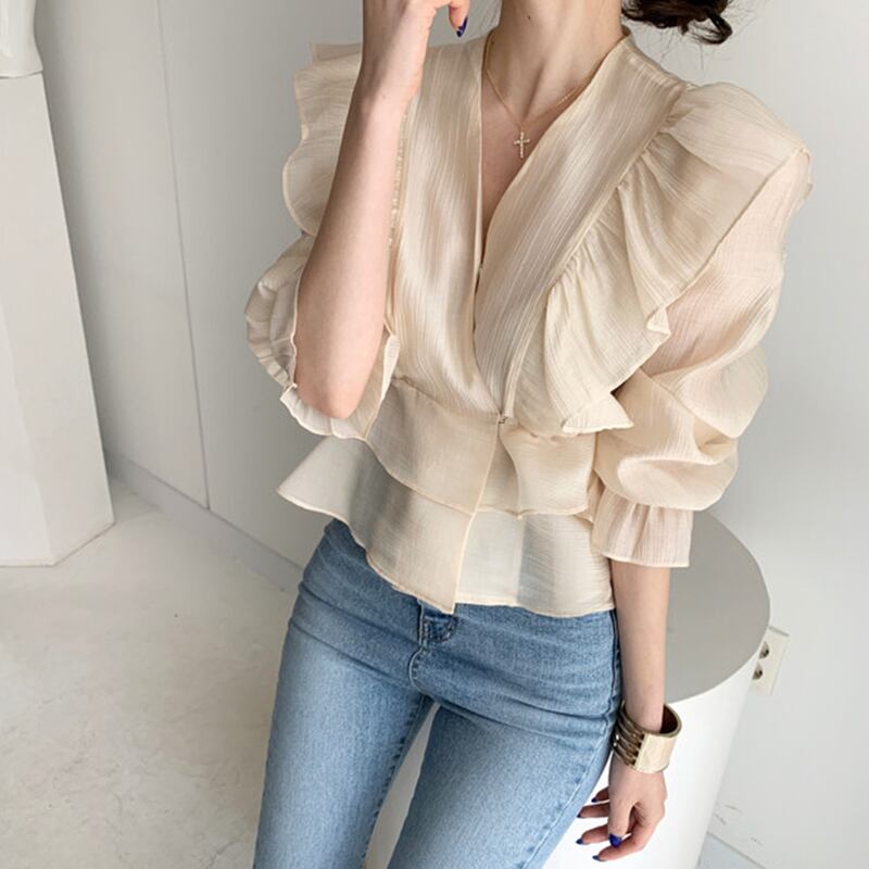 Vネックシフォンシャツ 人気デザイン トップス ブラウス フェミニン アプリコット ショート丈 袖あり 半袖 Vネック スリム 細身 タイト フリル 外国デザイン 乙女 大人女子 透け感 シースルー 大人女子 大人 上品 おしゃれ きれいめ シンプル エレガント レトロ レトロ風 こなれ感 ラフ 個性的 デザイン 主役級 存在感 無地 ライン 春 スプリング 20代 30代 40代 レディース 女性用 オフィス ビジネス OL デート お出かけ 女子会 着回し 普段使い トレンド ファッション コーデ