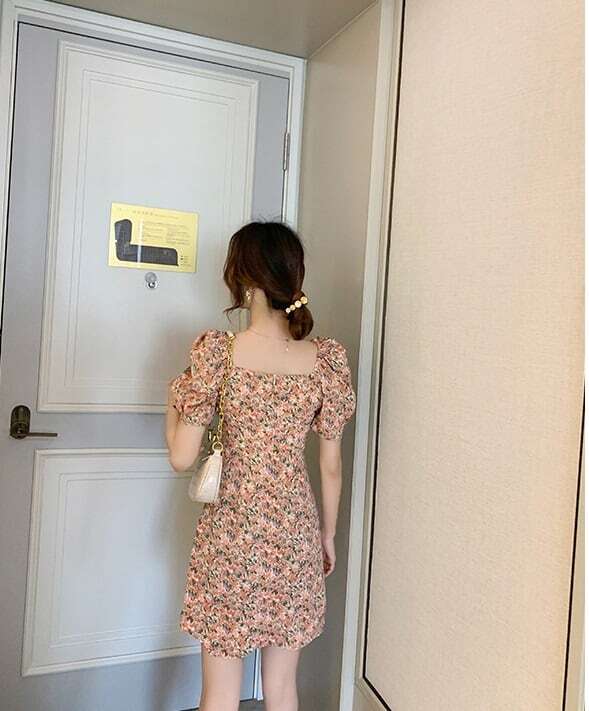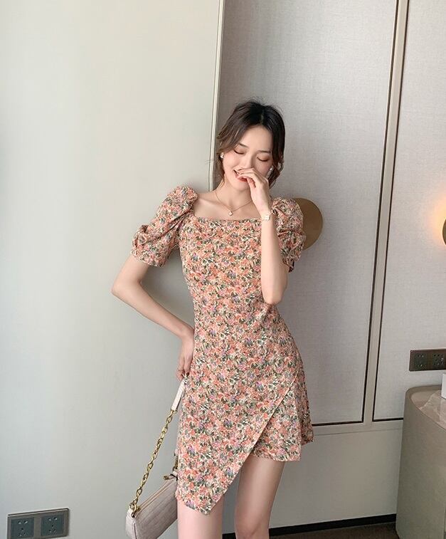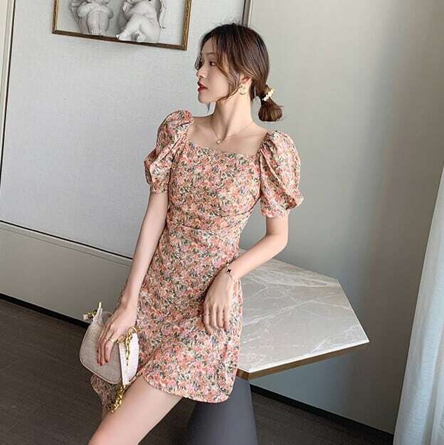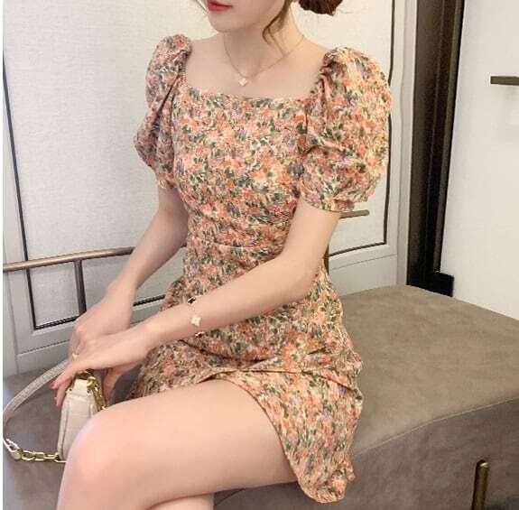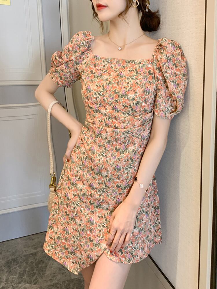 ミニワンピ 小花柄 半袖 レディース パワーショルダー スクエアネック 夏ワンピ ミニスカート 台形スカート 巻きスカート パフスリーブ かわいい おしゃれ トレンド レトロ感 花柄 総柄 オレンジ系 涼し気 夏服 大人女子 大人可愛い 10代 20代 30代 セクシー 通勤 通学 学生 旅行 休日 お出かけ 避暑地 リゾート ドライブ デート 夏休み 簡単コーデ 着まわせる お食事 女子会 海 プール 韓国ファッション オルチャン 可愛い 低価格 インポート お買い得 低価格 普段使い 着やすい