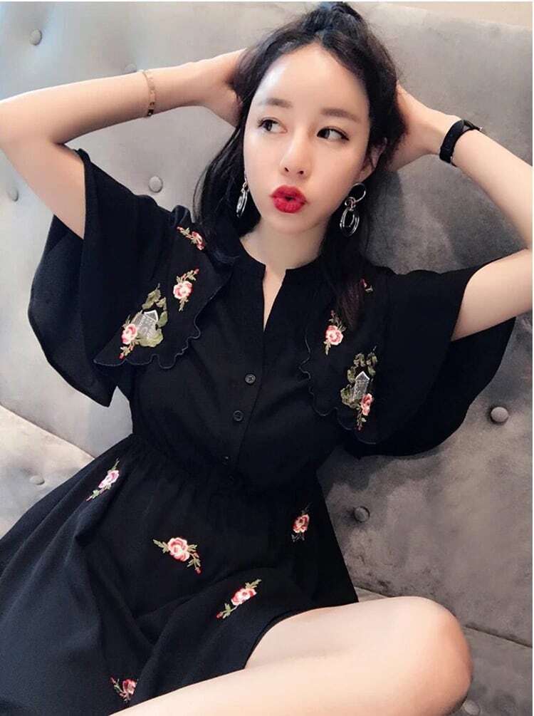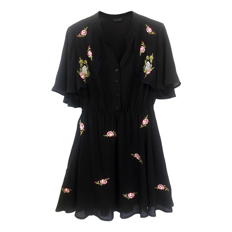 小花柄ワンピース 半袖 レディース 黒 シフォンワンピ ミニワンピ バラ柄 襟なし フリル袖 フリル Vネック 花柄 フラワーモチーフ ひざ丈 夏服 夏ワンピ シック クール おしゃれ かわいい 大人可愛い モテ服 通勤 通学 デート ランチ 女子会 飲み会 ショッピング 普段使い お出かけ レトロ感 大人 レトロシック フレンチシック サイズ豊富 ゆったり ゆったりサイズ 韓国ファッション オルチャン インポート プチプラ お買い得 女子人気 低価格 10代 20代 L XL 2XL 3XL 4XL