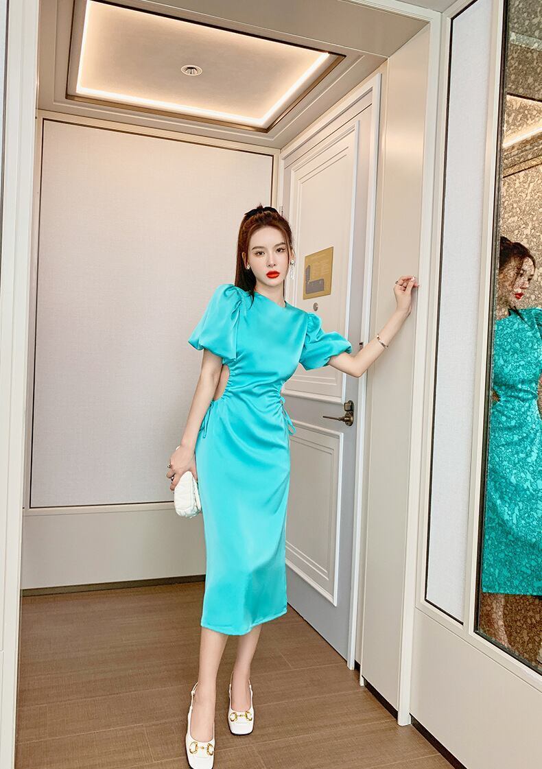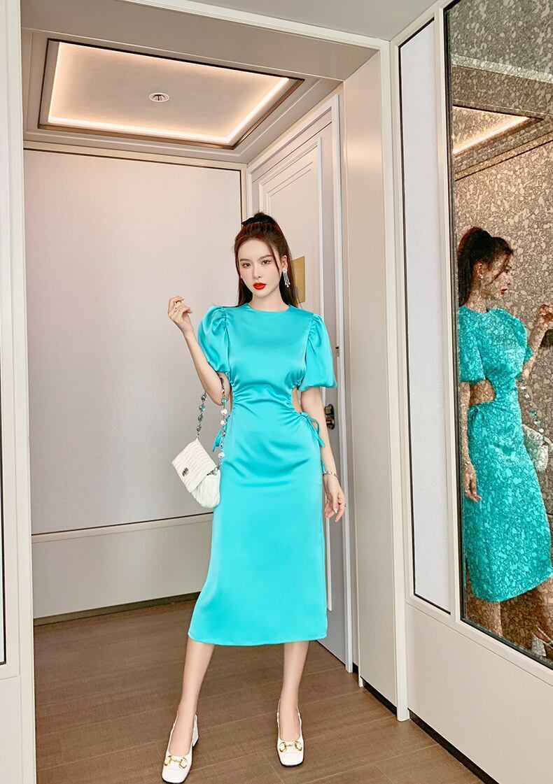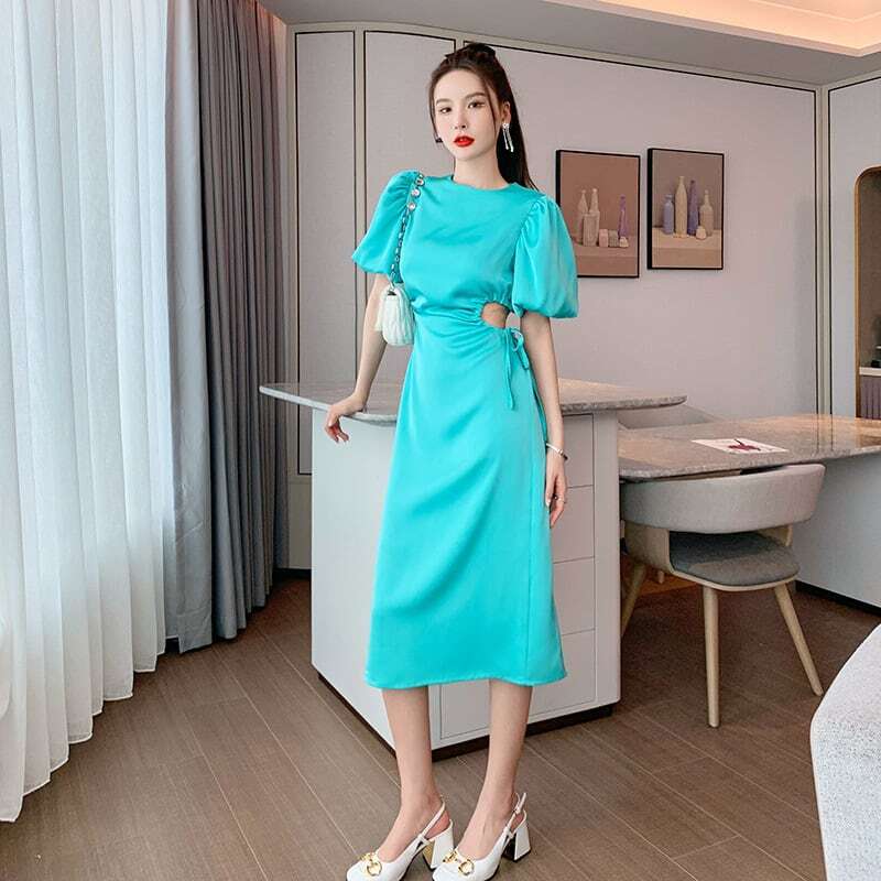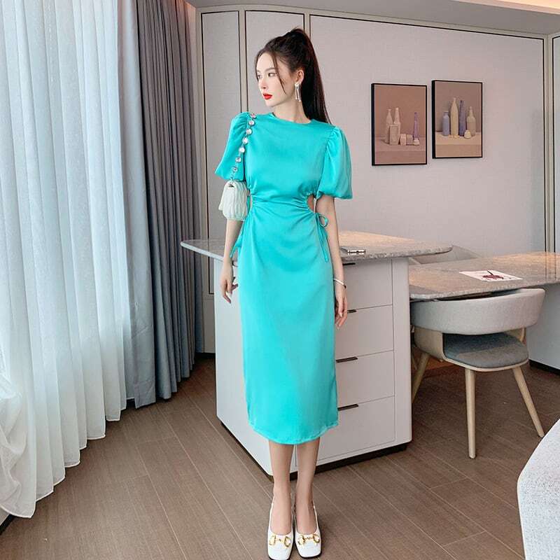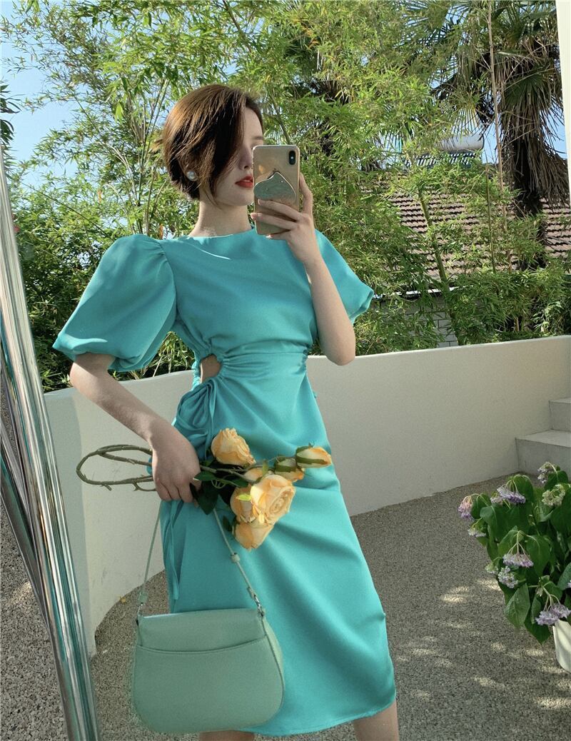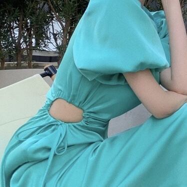 ワンピース ドレス レディース 女性用 半袖 丸襟 薄手 パフスリーブ バブルスリーブ ロング丈 膝下丈 ジッパー チャック レトロ 大人可愛い カジュアル 大人カジュアル かわいい ガーリー おしゃれ かっこいい 大人女子 甘め メンズライク レディライク リボン 単色 グリーン 緑 エメラルドグリーン 春 夏 お出かけ デート 休日 リゾート お呼ばれ エレガント 韓国ファッション トレンド OL 学生10代 20代 30代 個性的 人気 シンプル ラフ ゆったり こなれ感 スリッド タイト セクシー