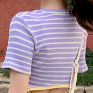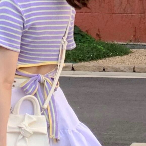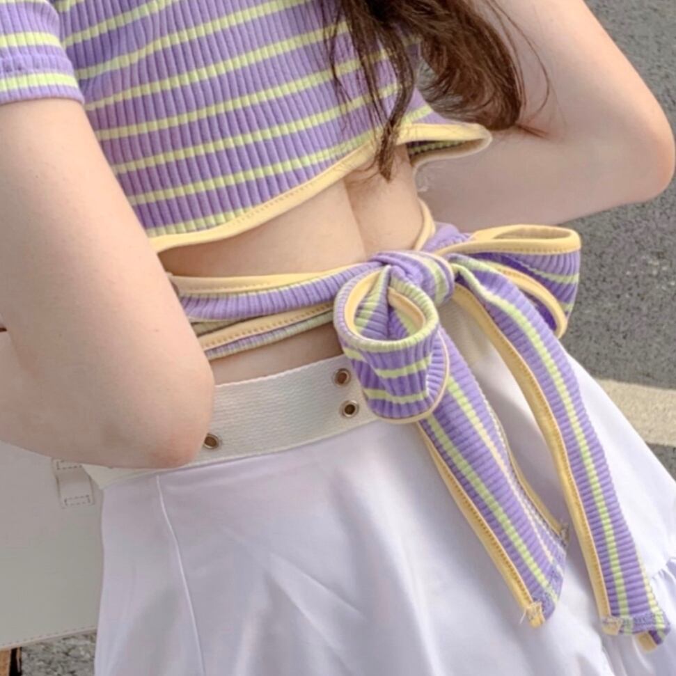 トップス レディース ニット 袖あり 半袖 襟なし Uネック ラウンドネック バックシャン バックリボン リボン パステルカラー 紫 パープル ストライプ ボーダー かわいい 大人可愛い 大人 大人女子 きれいめ おしゃれ お洒落 シンプル ラブリー キュート ガーリー フェミニン 10代 20代 学生 通学 デート お出かけ 女子会 休日 普段使い カジュアル パーティー イベント 春 夏 モテ こなれ感 抜け感 個性的 着回し リゾート ルーズ ゆる 上品 エレガント セクシー 可憐 インパクト
