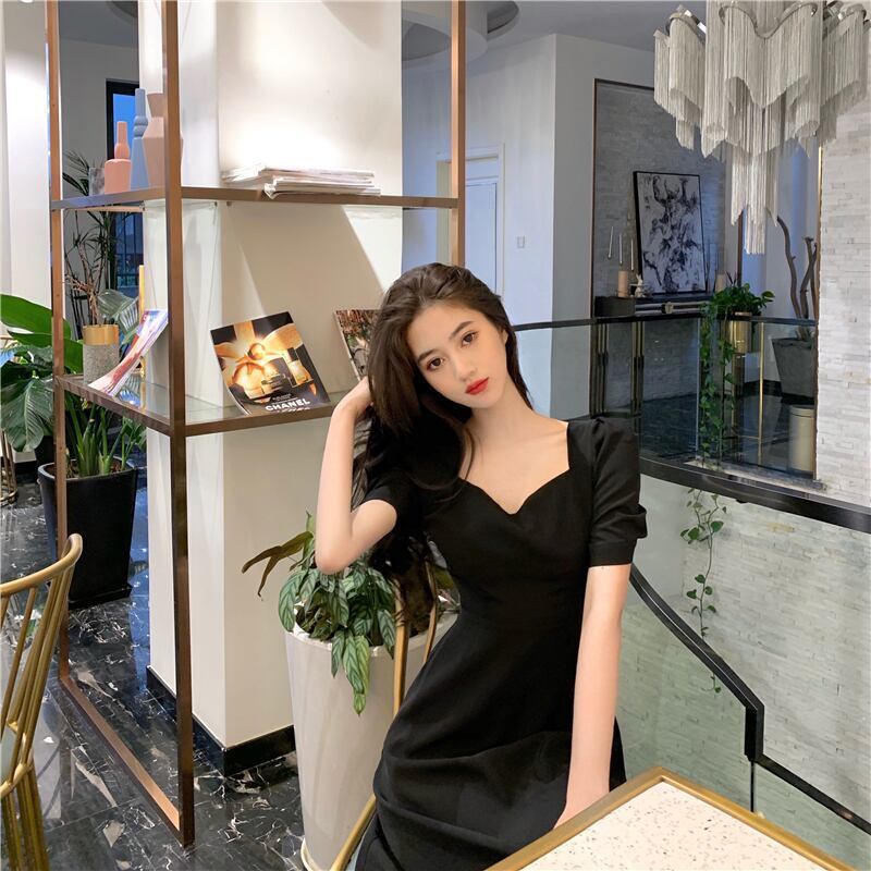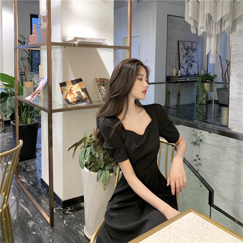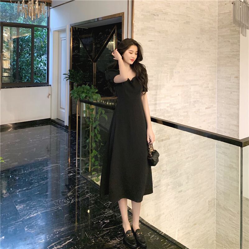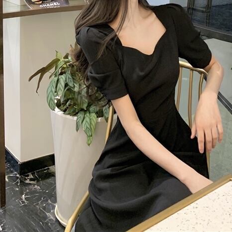 バックリボンワンピース ワンピドレス ブラック 後ろリボン スクエアネック 半袖 パフスリーブ パフ袖 フレアースカート かわいい 大人綺麗 シンプル 韓国デザイン オルチャン 海外ファッション 外国ファッション 海外デザイン ロング丈 ロングワンピース 大人きれい 綺麗目 大人女子 プチプラ 見え高 人気デザイン パーティー 二次会 結婚式 ウエディング デート スペシャル 発表会 誕生日 お祝い プレゼント フレンチ シック ウエスト丈スカート 夏 レトロ バックレス 半袖ワンピース レディース