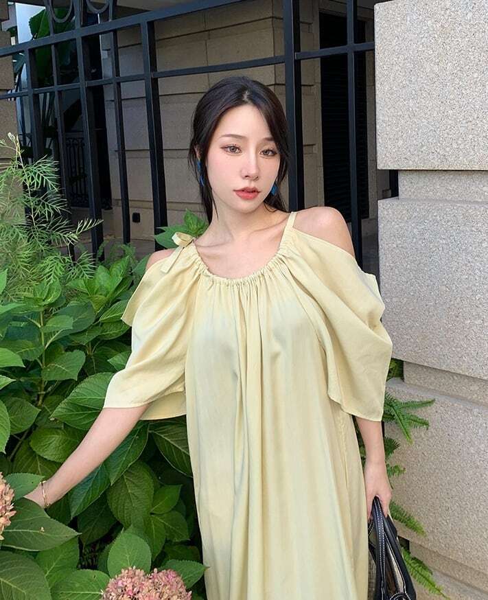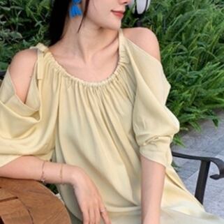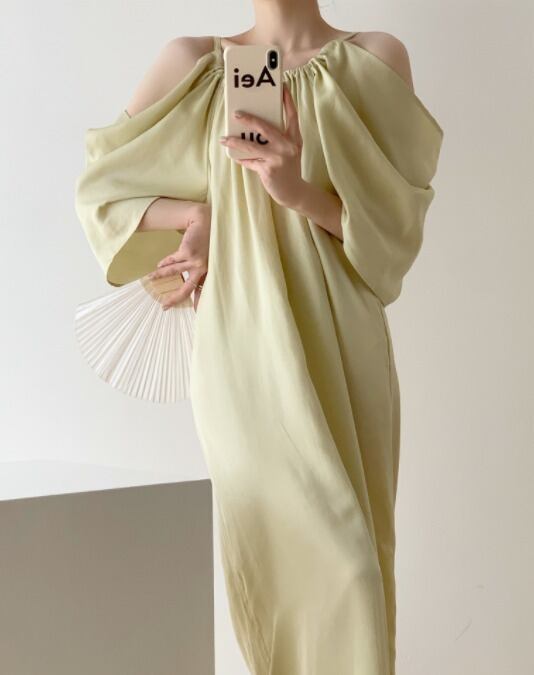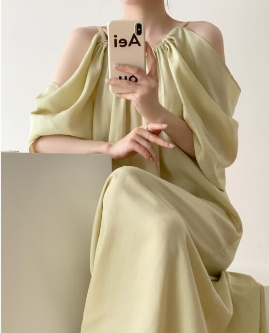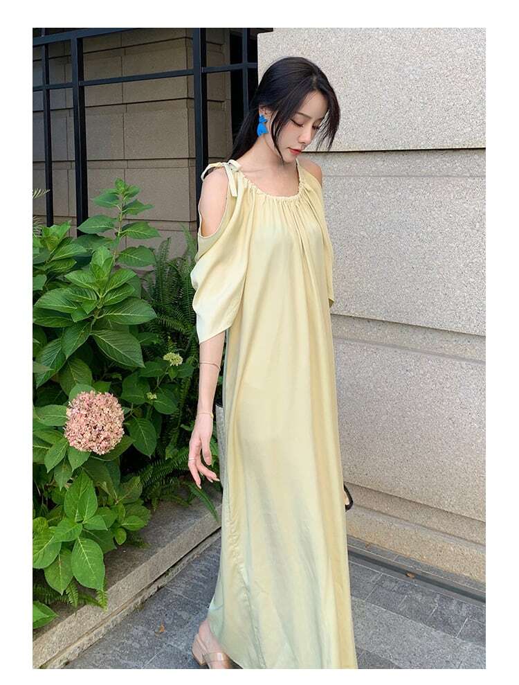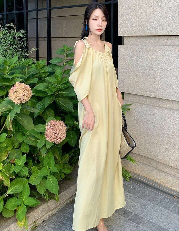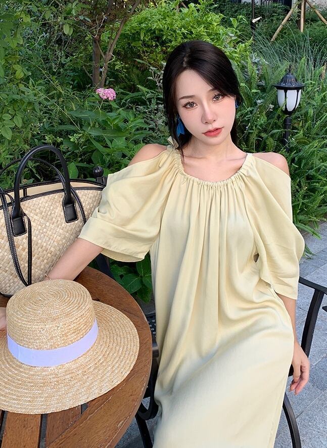 ワンピース ドレス レディース 女性用 半袖 ロング丈 マキシ丈 薄手 丸襟 肩出し オフショルダー ストレート Aラインスカート レトロ 大人可愛い カジュアル 大人カジュアル かわいい ガーリー おしゃれ かっこいい 大人女子 甘め メンズライク レディライク ワンサイズ リボン 単色 黄 イエロー 緑 グリーン 夏 お出かけ デート 休日 リゾート 海辺 ビーチ 韓国ファッション トレンド OL 学生 10代 20代 30代 個性的 人気 シンプル ラフ こなれ感 セクシー ゆったり 大きめ
