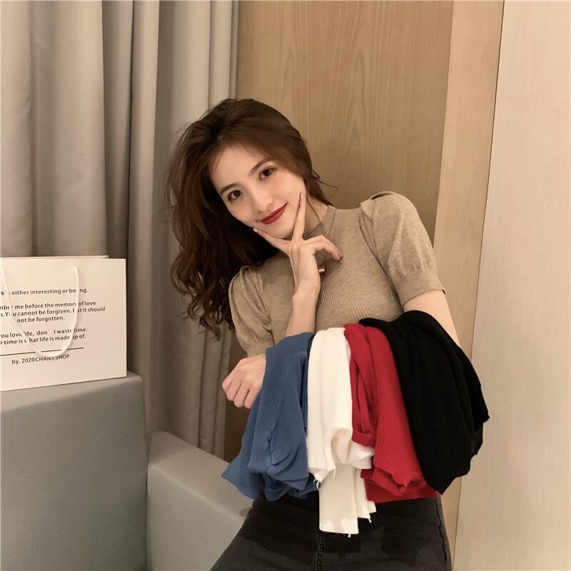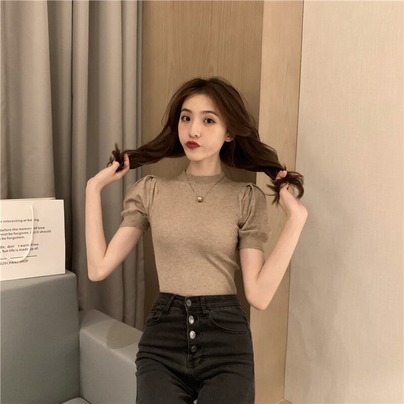 トップス レディースニットソー 袖あり 半袖 パフスリーブ ハイネック 細身 Iライン。最新トレンドのパフスリーブで、大人可愛い印象を与えるトップスです。シンプルで清潔感のあるデザインで、オフィスやビジネス、学生や通学、デートやお出かけなど、様々な場面に対応できます。ハイネックが首元をスッキリ見せるので、首まわりも綺麗に決まります。また、縦長のIラインデザインと細身のシルエットが、すっきりとした印象を与え、脚長効果も期待できます。素材には、肌触りが柔らかく着心地の良い素材を使用しています。シンプルながらも上品でフェミニンなデザインであり、大人女子の魅力を引き出してくれる一枚です。オルチャンスタイルから大人女子まで、幅広く対応するトップスです。