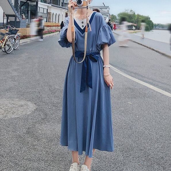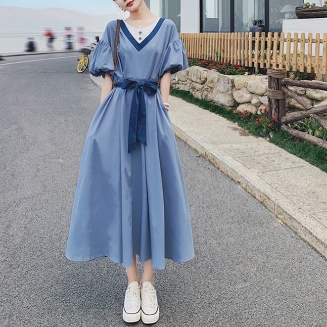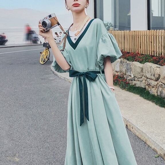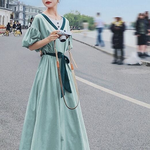 パフスリーブ 半袖 ドレス ワンピースドレス 夏 新しい 韓国バージョン ルーズ ウエスリボン ロングスカート ブルー グリーン 新作トレンディ ウエストリボン メリハリ 海外デザイン かっこいい ラグジュアリー キュート かわいい 個性的 デザイン 主役級 存在感 柄 配色 秋 オータム 20代 10代 人気 トレンド 大人セクシー しっとり ウエスタン お出かけファッション イベント パーティーワンピース おすすめ 大人女子 デザイン重視 お出かけファッション 人気ワンピース おしゃれワンピース