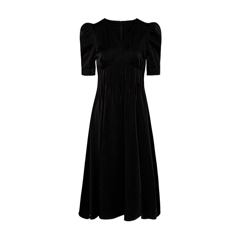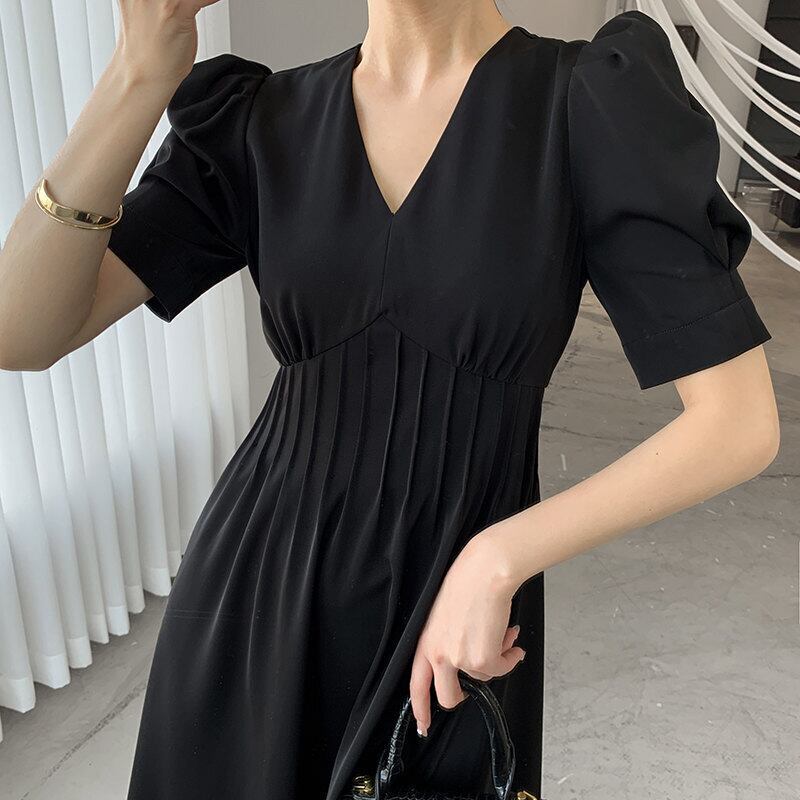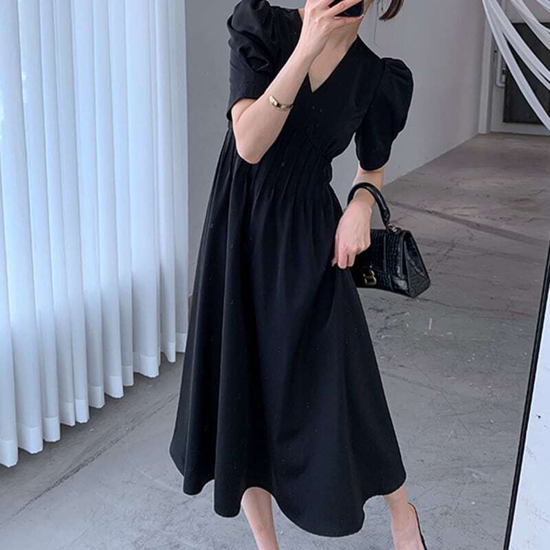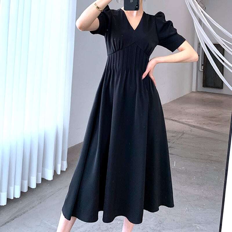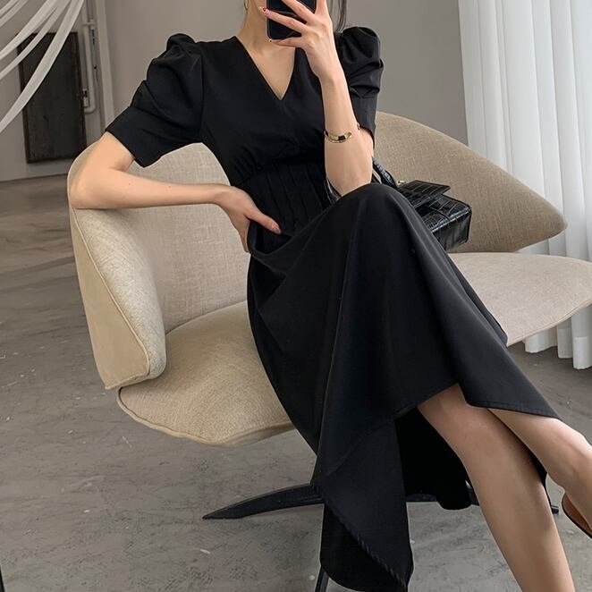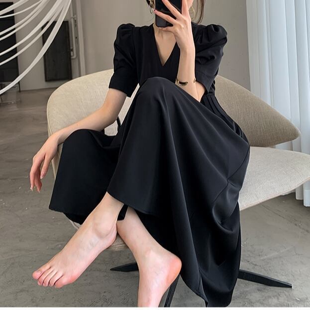 ドレススカート ワンピース ブラック 黒 新作 半袖 パフスリーブワンピース 無地 シンプル 綺麗目 新夏 ラージサイズ サイズ豊富 ウエストアクセント Vネック トレンドスタイル ハイエンドドレス ノーブル ロングスカート Aラインワンピース 体型カバー かわいい 大人可愛い きれいめ シンプル カジュアル 大人 上品 おしゃれ お洒落 大人可愛い 大人女子 M L XL 2XL 3XL 4XL 20代 30代 デート お出かけ 女子会 休日 着回し 普段使い 韓国 韓国系 オルチャン モテ プチプラ