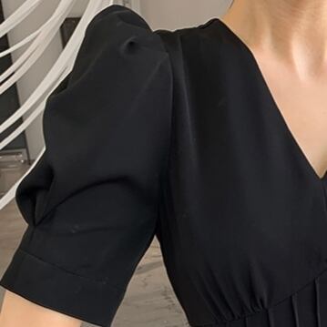 エレガントなドレススカートワンピースが新登場。黒の無地でシンプルながら、上品な印象を与えるパフスリーブとウエストアクセントが魅力です。VネックとAラインシルエットでスタイルアップも叶います。