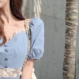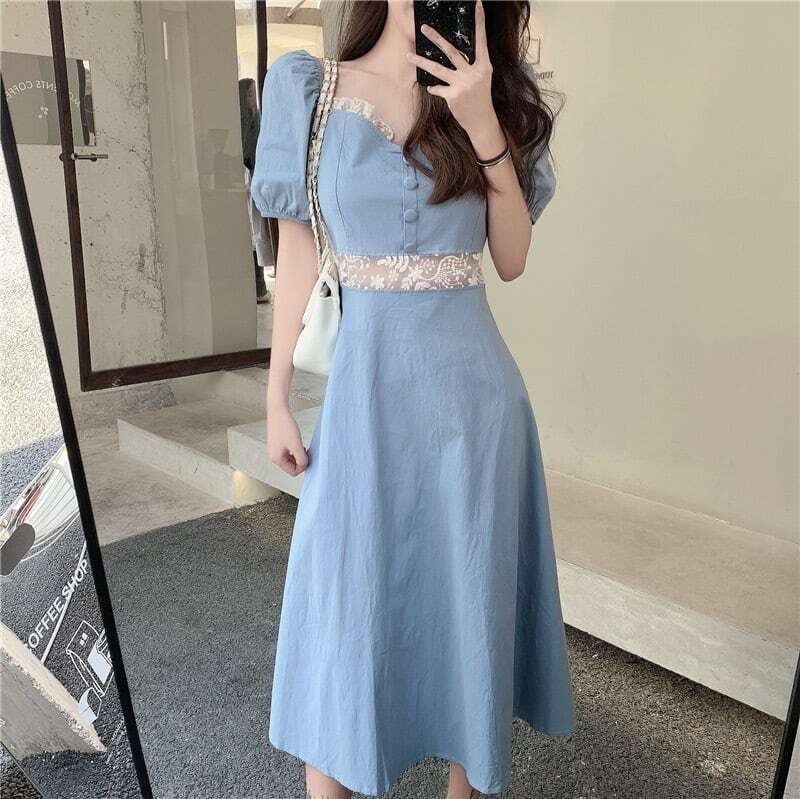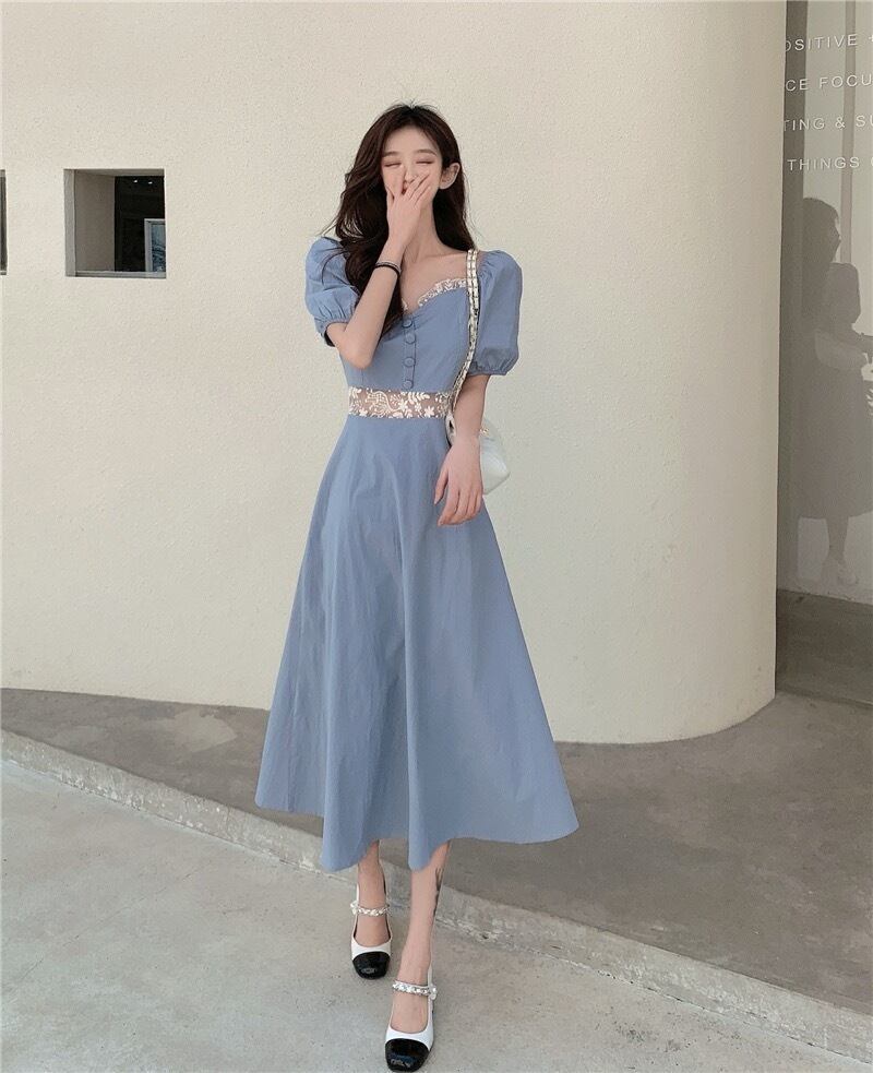 ワンピース レディース ひざ下 ロング丈 ロング ロングスカート スカート 半袖 青 ブルー 水色 新作 パフスリーブ フレンチ 春 スクエアカラー Aラインスカート Aライン プルオーバー ハイウエスト レース 大人可愛い カジュアル 大人カジュアル かわいい ガーリー おしゃれ かっこいい 大人女子 レトロ 洋風 シック メンズライク S M L XL 2XL お出かけ デート 韓国ファッション トレンド OL 通勤 通学 学生 10代 20代 30代 人気 個性的 こなれ感 スタイル オルチャン