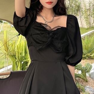 大胆なパフスリーブとフェミニンなレースデザインが魅力のワンピースです。もっと大人っぽく、上品に見せたい方におすすめなアイテムです。ブラックの色味がさりげなく高級感を醸し出し、シックな印象も与えます。ボリュームのある袖とスイングスカートが女性らしさを引き立てます。夏にぴったりな半袖で、キュートながらも大人可愛い雰囲気を醸し出しています。通勤・通学、デート、お出かけ、女子会など、様々なシーンで使用でき、コーディネートによって印象が変わるのも魅力の一つです。一枚持っているだけで、周りの視線を集めること間違いなし!