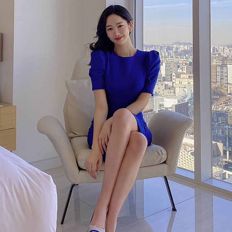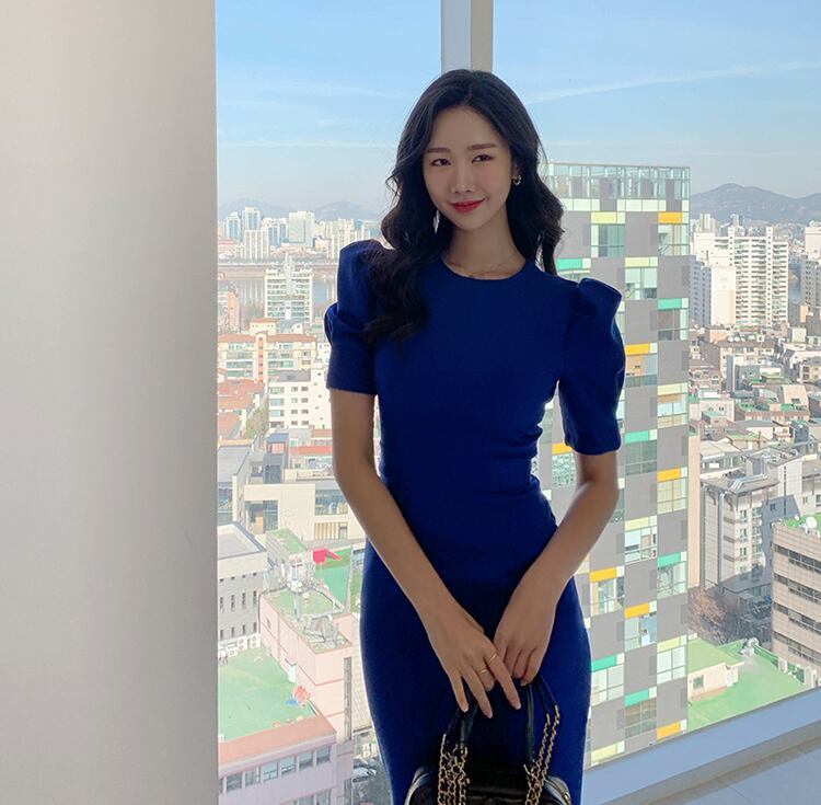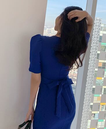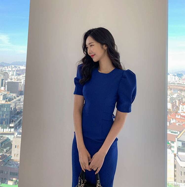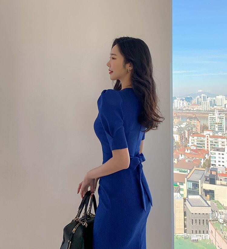 ワンピース レディース タイトスカート ワンピドレス 膝丈 ひざ丈 袖あり 半袖 パフスリーブ バルーンスリーブ Uネック ラウンドネック 襟なし スリム タイト 細身 ストレート ウエストマーク ウエストリボン バックリボン リボン スリット バックスリット ファスナー 青 ブルー かわいい 大人可愛い 大人 大人女子 きれいめ おしゃれ お洒落 シンプル ラブリー キュート ガーリー 10代 20代 30代 学生 デート お出かけ イベント 上品 エレガント 結婚式 二次会 披露宴 パーティー
