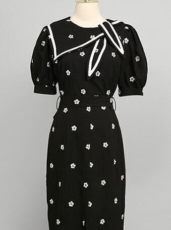 甘さとエレガントさを併せ持つ黒刺繡ワンピース。肩の弓結びやパフスリーブがフェミニンな印象を与えます。
