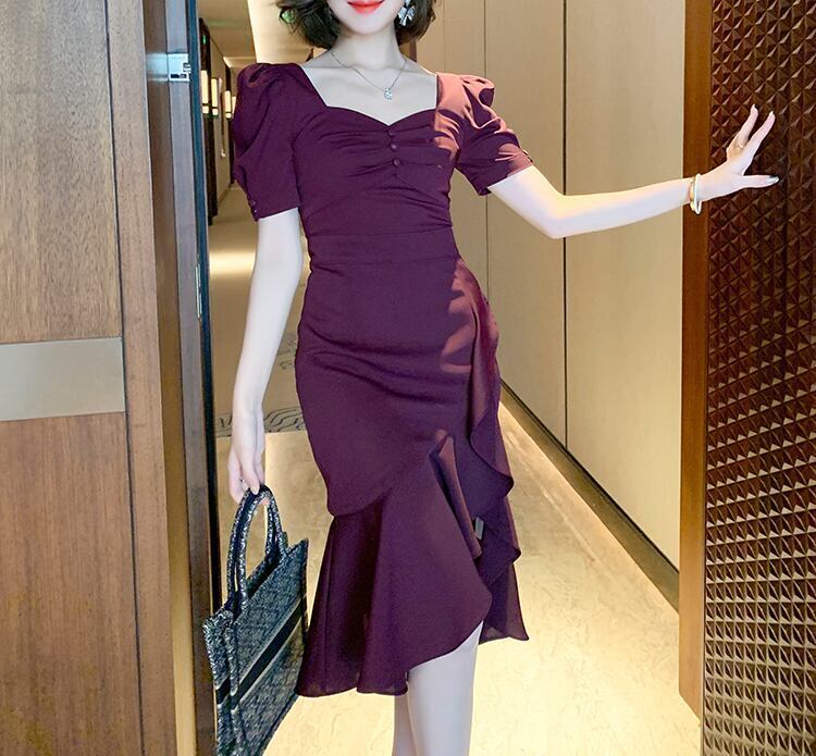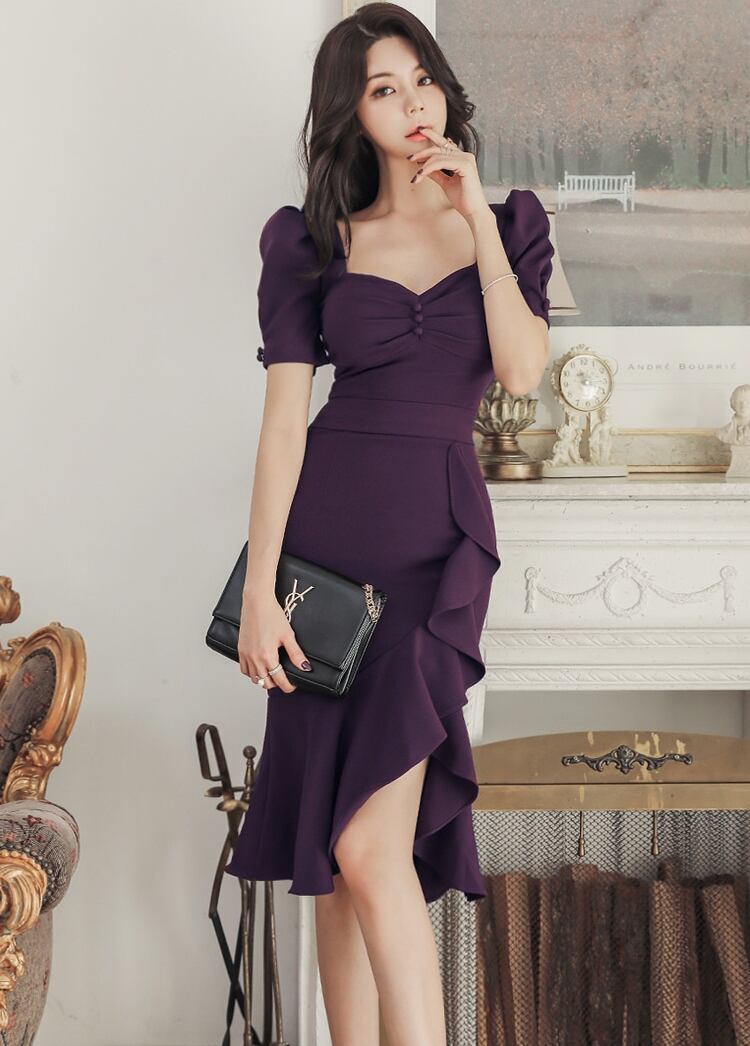 ドレスワンピ レディース ファスナー ワンピース タイトスカート ひざ丈 膝丈 袖あり 半袖 パフスリーブ スクエアネック 襟なし スリム タイト 細身 ペプラム ギャザー ボタン スリット 切り替えデザイン 紫 ダークパープル パープル かわいい 大人可愛い 大人 大人女子 きれいめ おしゃれ お洒落 シンプル ラブリー キュート 10代 20代 30代 学生 通学 デート お出かけ 女子会 休日 イベント こなれ感 抜け感 上品 エレガント セクシー フォーマル 結婚式 二次会 披露宴 パーティー
