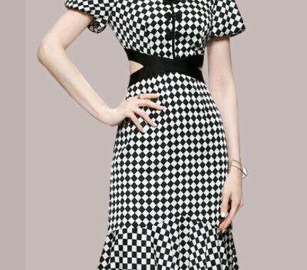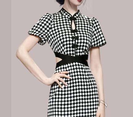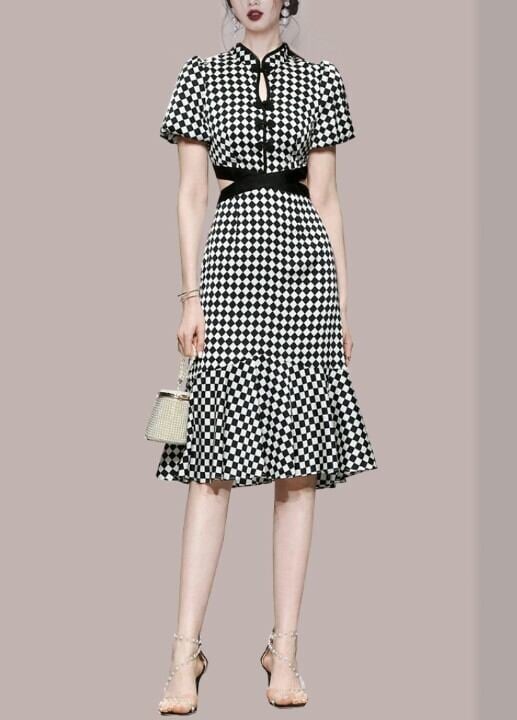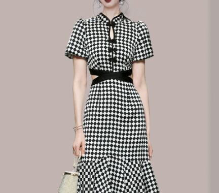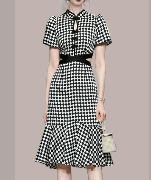 チャイナ風ワンピース フィッシュテール スカート チャイナ風ドレス 気品 白黒チェック チャイナ服 10代 20代 30代 40代 フィッシュテールスカート ホームパーティー デート 通勤 買い物 観劇 チャイ風市松ワンピース チェックドレス ワンピ 切り替えスカート 半袖チャイナドレス 半袖ランタン袖 ランタン キュート チャイナチェック フィッシュテールランタン サマードレス 夏ワンピース 半袖ランタンスリーブ ハイウエスト チャイナ襟 ランタン袖 レディースドレス 白黒格子模様 チャイナ