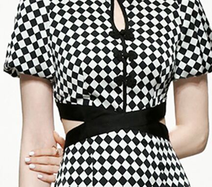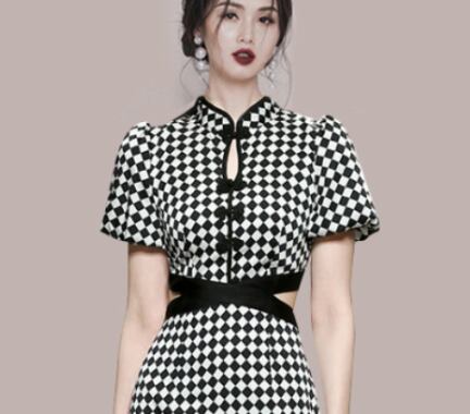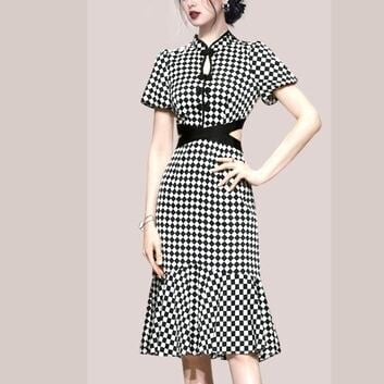 夏の暑さにも負けないサラッとした素材と、エレガントさと可愛らしさを兼ね備えたデザインが魅力的なチャイナ風ワンピース。白黒のチェック模様がアクセントで、腰から裾にかけての切り替えスカートが女性らしいフィッシュテールスカートになっています。