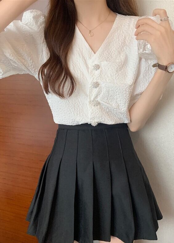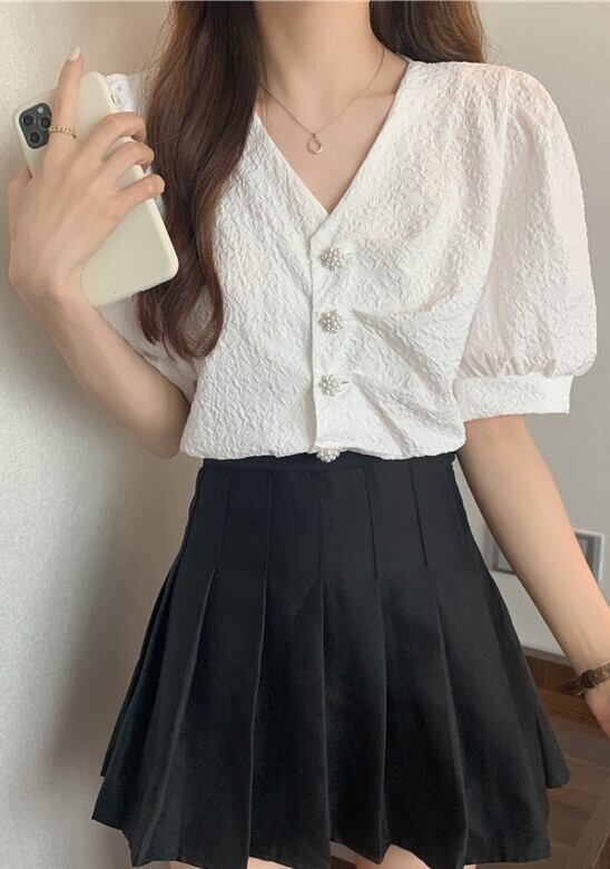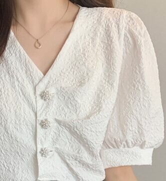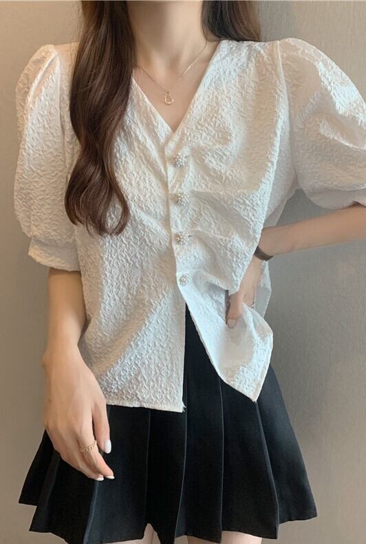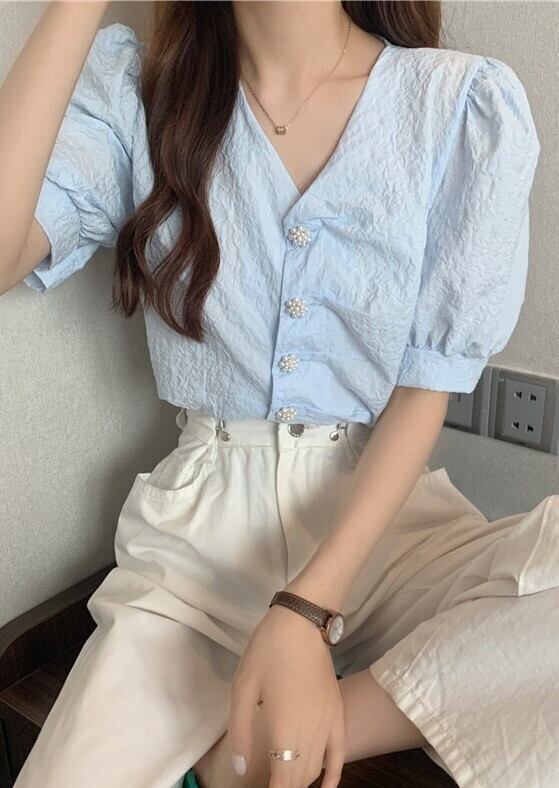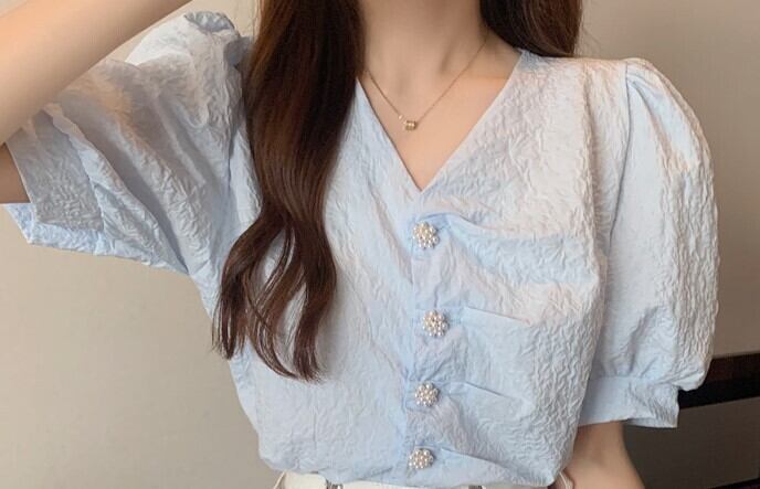 個性的 半袖 ブラウス フレンチスリーブ バブルスリーブ ホワイト 水色 Vネック 20代 30代 40代 フラワーボタン 通勤 買い物 夏半袖 ポリエステル 夏フレンチ トップス シック ヴィンテージ ホワイト シャツ ブラウス V襟 通学 デート レディース 白ボタン 袖カウス 前ボタン 2色 無地 エレガント 女子会 普段着 チャーミング ヴィンテージカラー 通学 キュートボタン 真珠風ボタン 字模様 シルエット ワンサイズ インオーバー シックブラウス Vカットシャツ ホワイトブラウス ブル