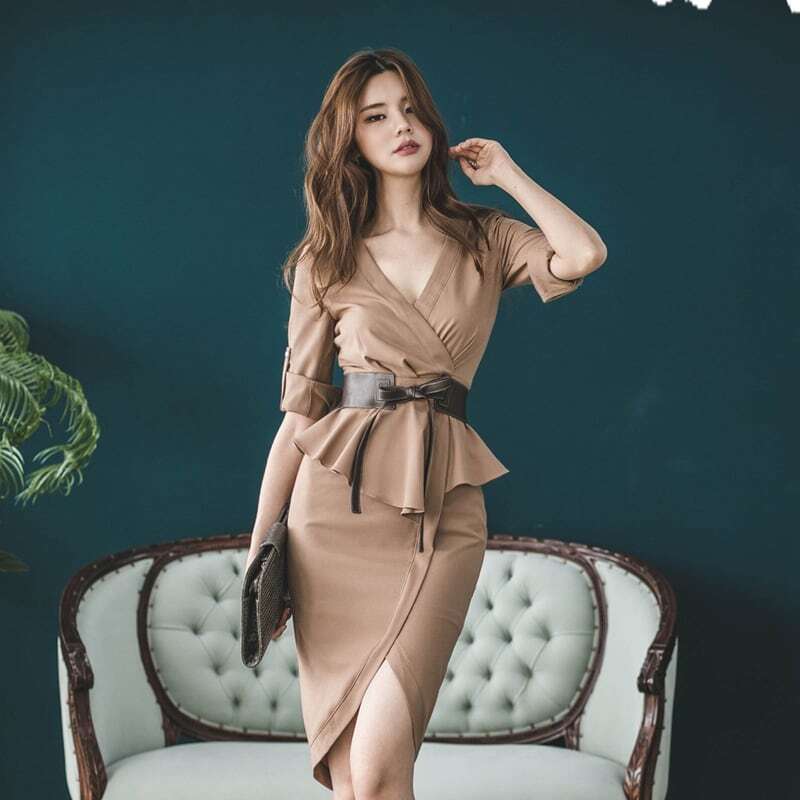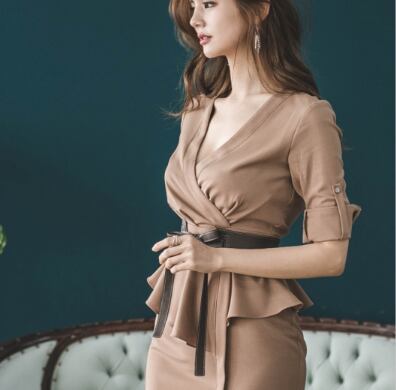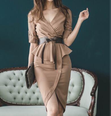 新作ワンピースは、タイトスカートが体型をカバーし、フェイクワンピースデザインで上品な印象を与えます。今季のトレンドカラーのカーキで、大人っぽくクールな印象を与えましょう。サマーシーズンにも楽しめる半袖と5分袖の選択肢があり、オフィスやビジネスシーンからデートやパーティーまで、幅広いシーンで着用できます。