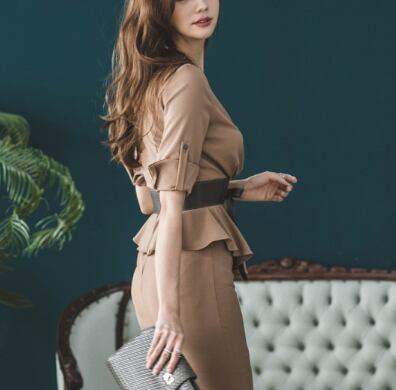 切り替えデザインでウエストマークをして、スリムなシルエットを作り出すデザインには、大人女子の魅力が詰まっています。ペプラムデザインで女性らしい雰囲気も演出し、存在感があります。生地はしっかりとした質感で、ドレープ感が美しく、美脚も叶います。